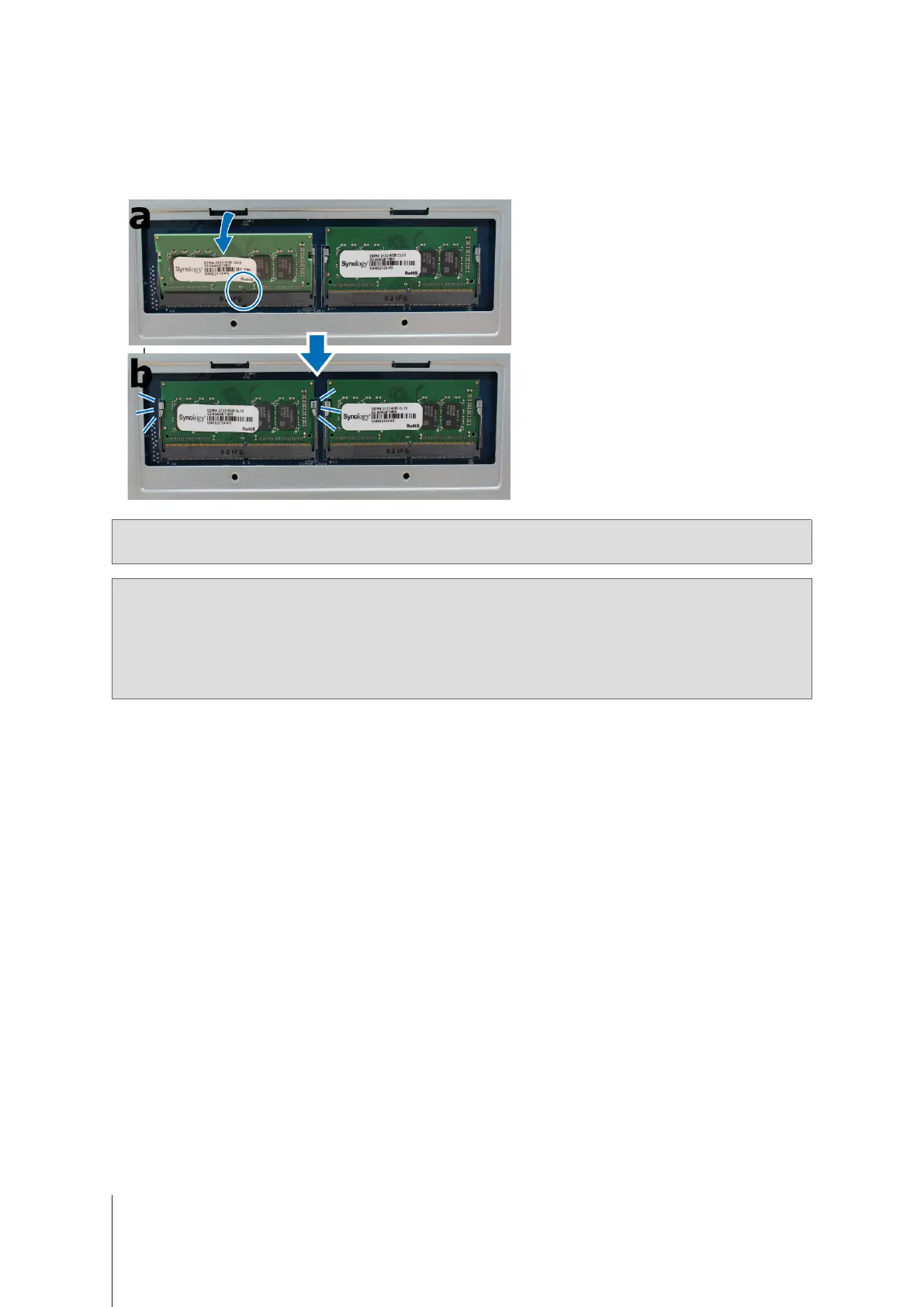 • Synology will not provide complete product warranty or technical support if non-Synology RAM modules are used