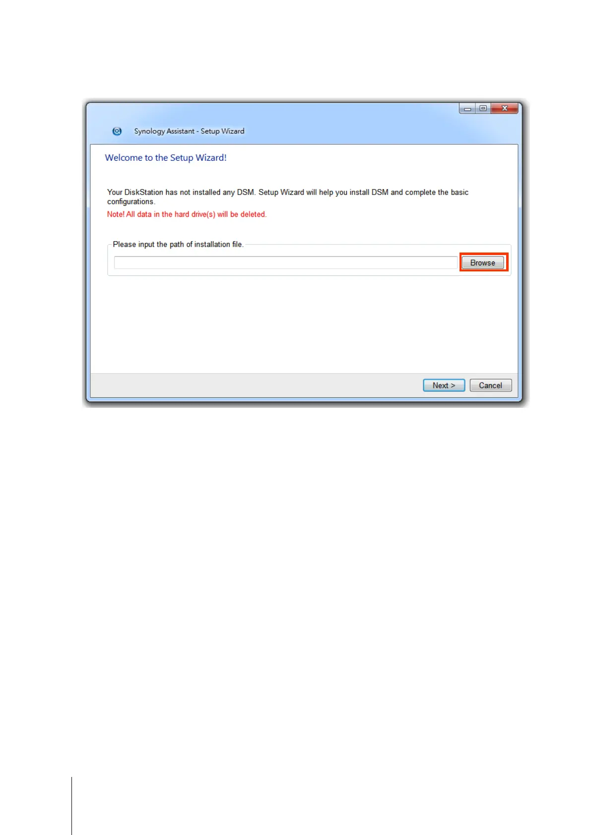 3 Click Browse to locate the DSM_[model name]_[number].pat installation file in the DSM folder of your