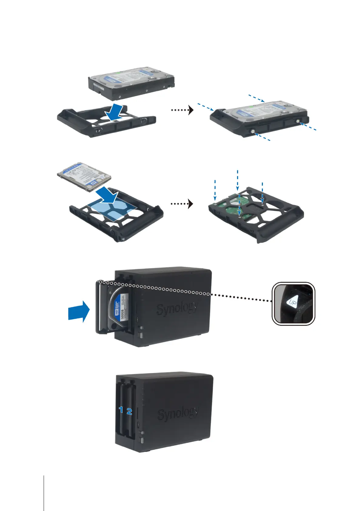 4 Make sure the side marked with "UP" is facing up, and insert the hard drive tray into the empty hard drive bay.