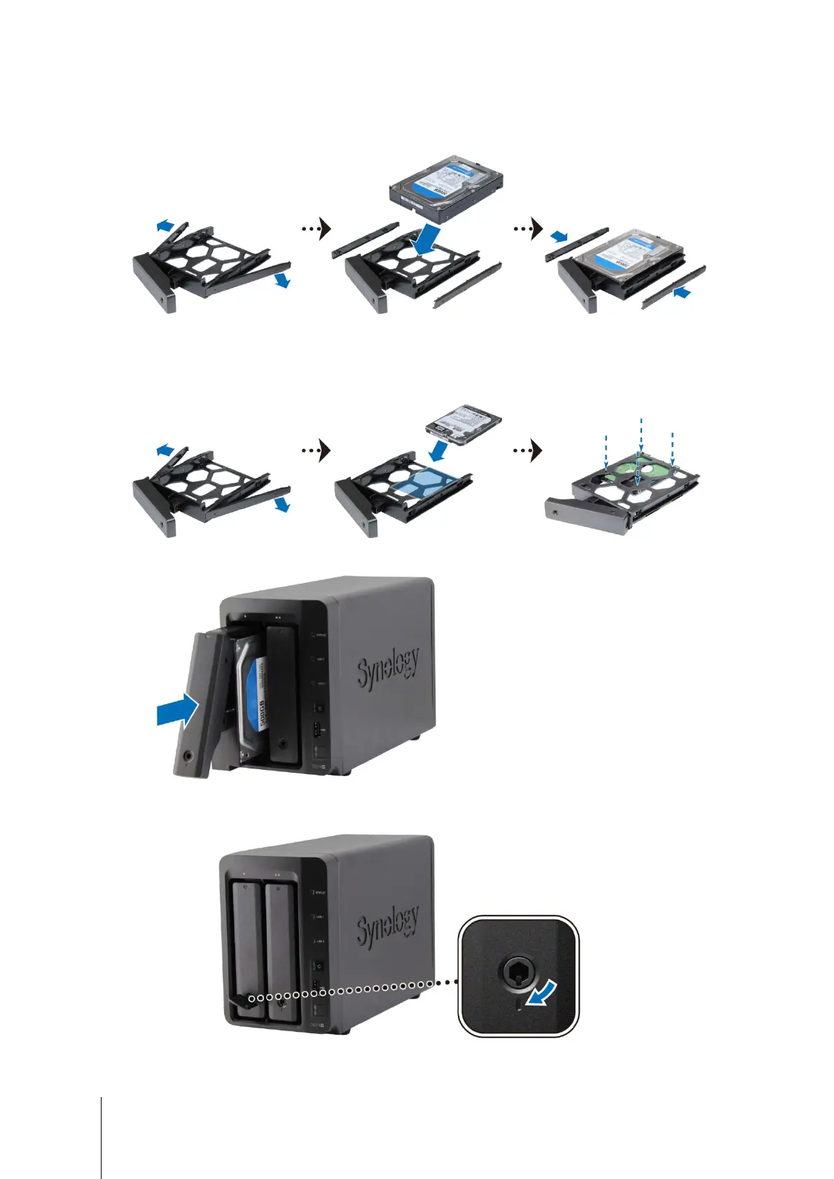 tray. Then insert the fastening panels to secure the drive in place.