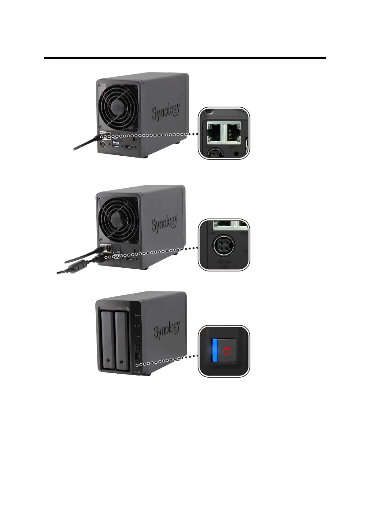 2 Connect the AC adapter to the power port of the DiskStation. Connect one end of the AC power cord to the AC