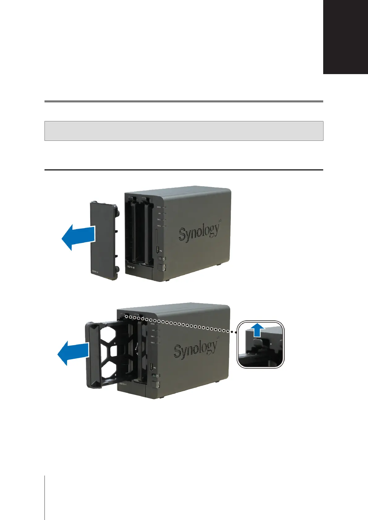 Push the latch upward and pull the handle to remove the drive tray from your DiskStation.