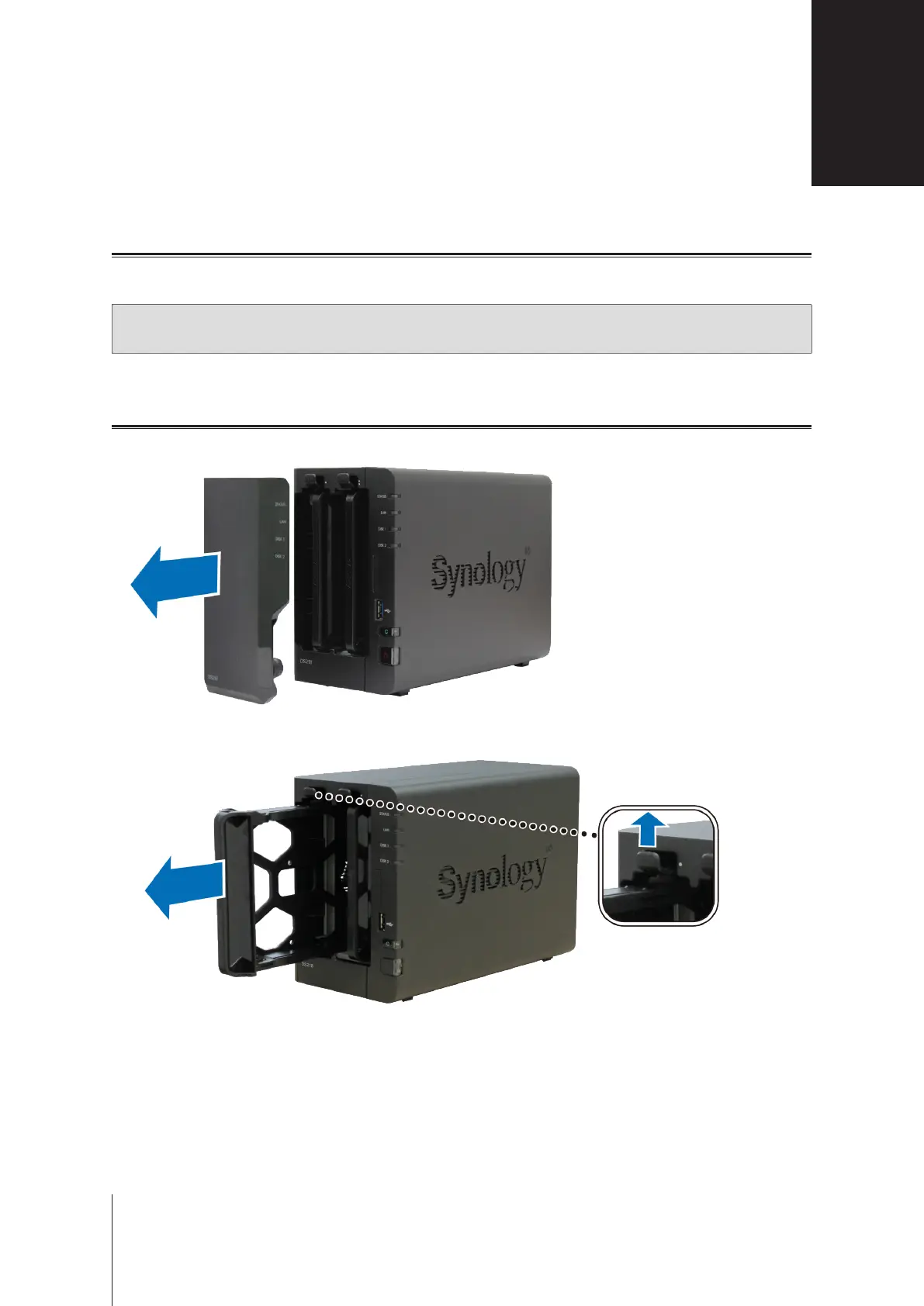 Push the latch upward and pull the handle to remove the drive tray from your DiskStation.