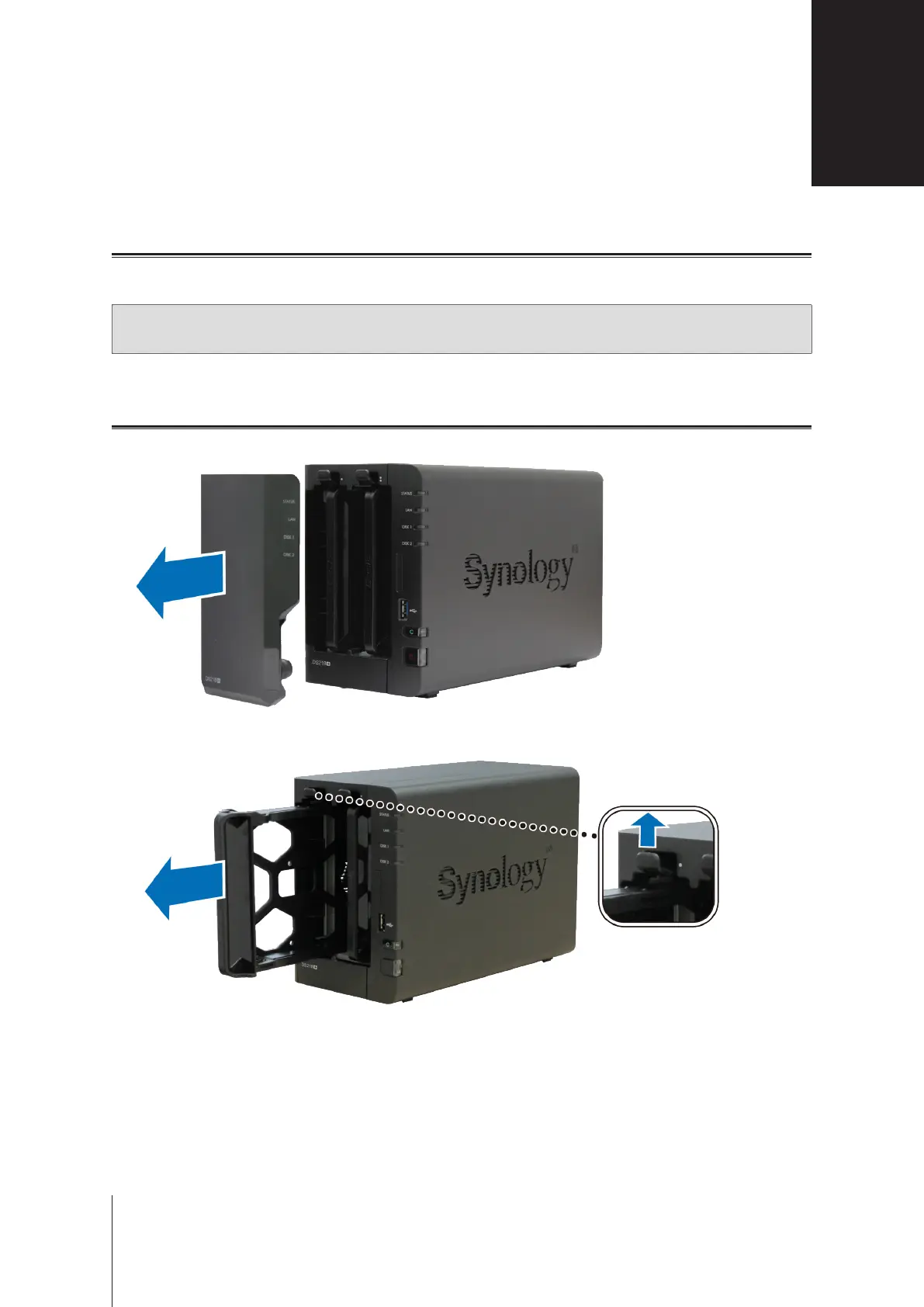 Push the latch upward and pull the handle to remove the drive tray from your DiskStation.