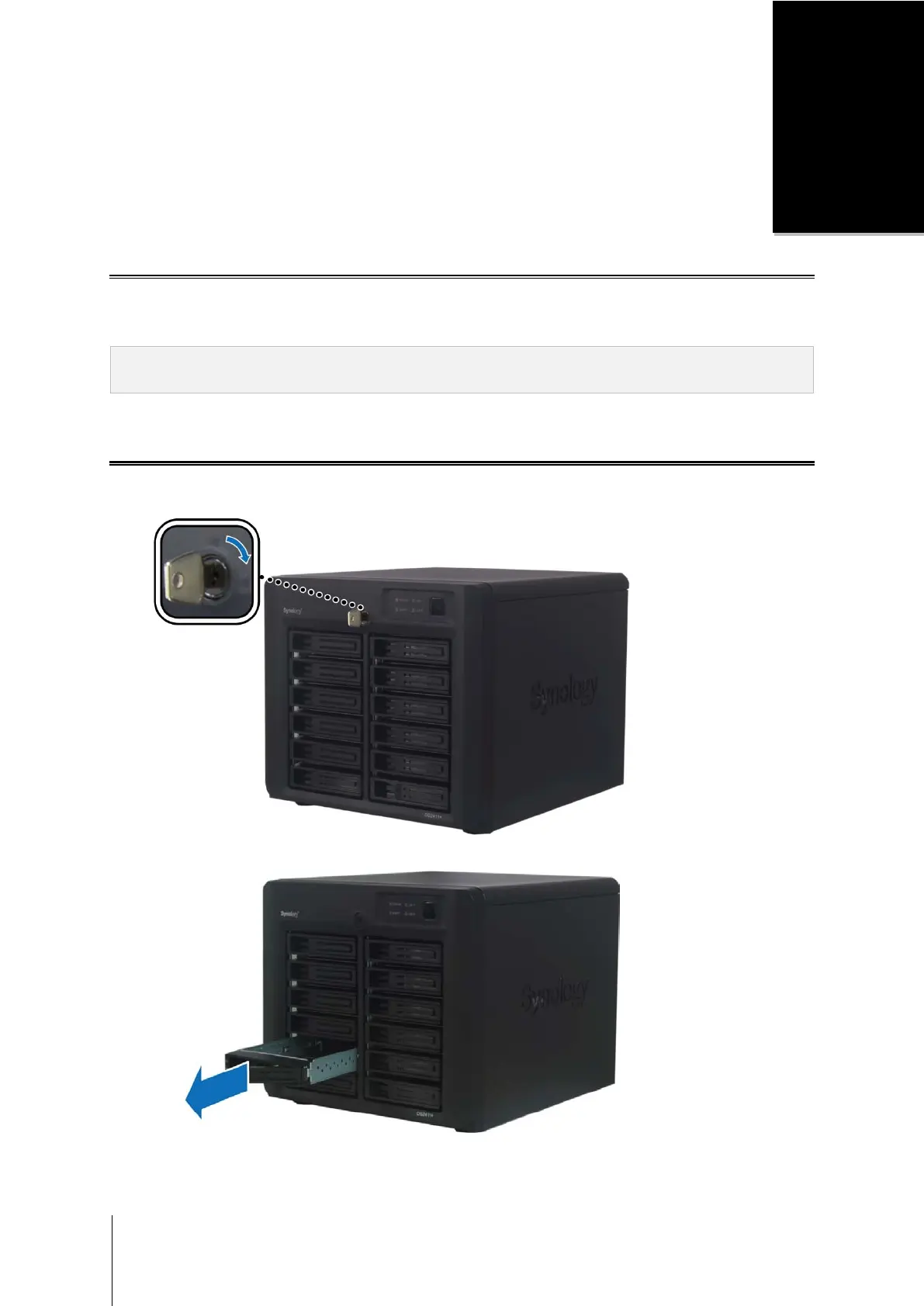 1 Insert the hard drive tray key into the hard drive tray lock, and turn the key 90˚ clock-wise (to the Unlock