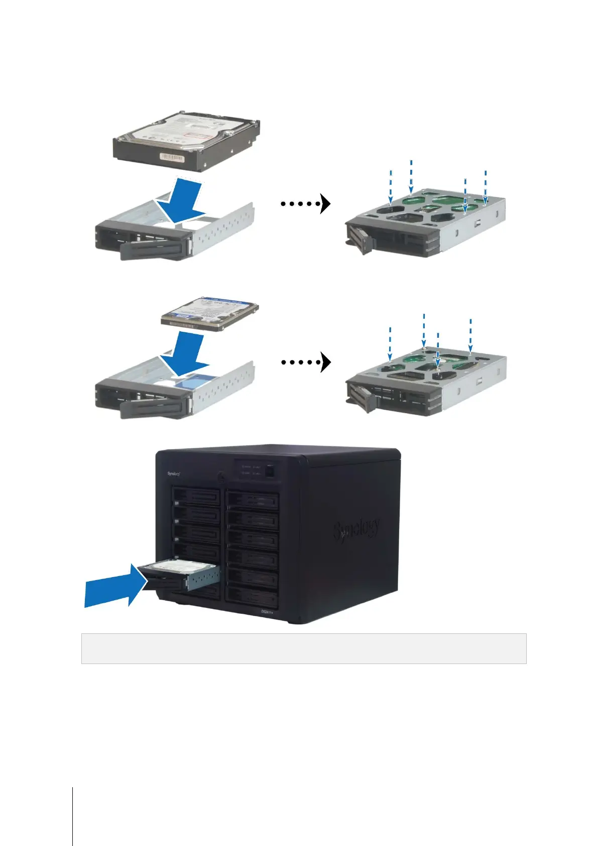 For 2.5” Hard Disk: Place the hard disk in the blue area (shown below) of the hard drive tray, turn the tray