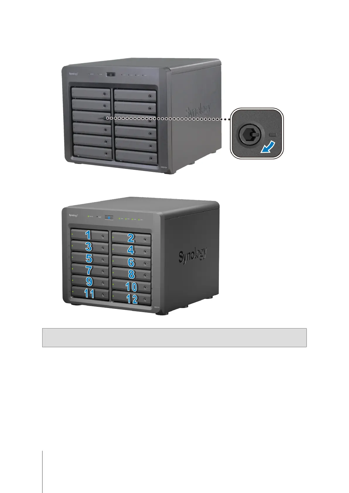 Insert the drive tray key into the drive tray lock, turn the key clockwise (to the “-” position) to lock the handle of