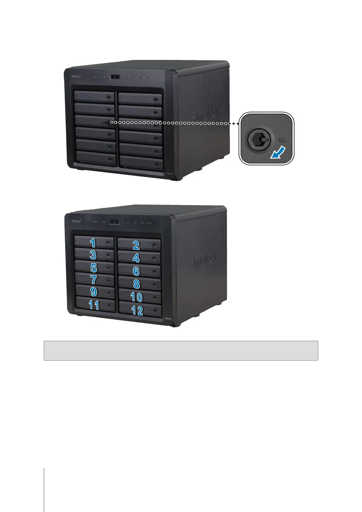 Insert the drive tray key into the drive tray lock, turn the key clockwise (to the “-” position) to lock the handle of
