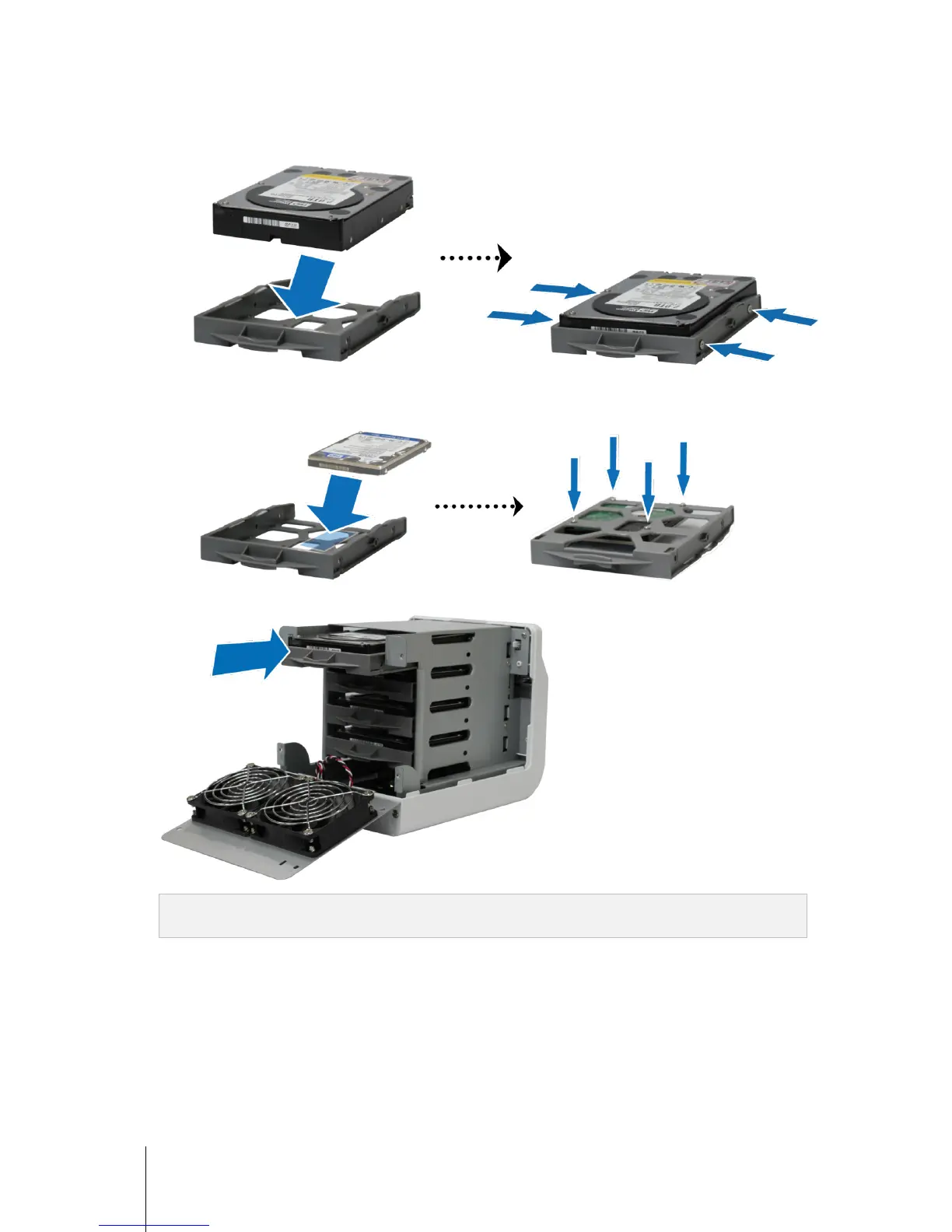 For 2.5” Hard Disk: Place the hard disk in the blue area (shown below) of the hard drive tray, turn the tray