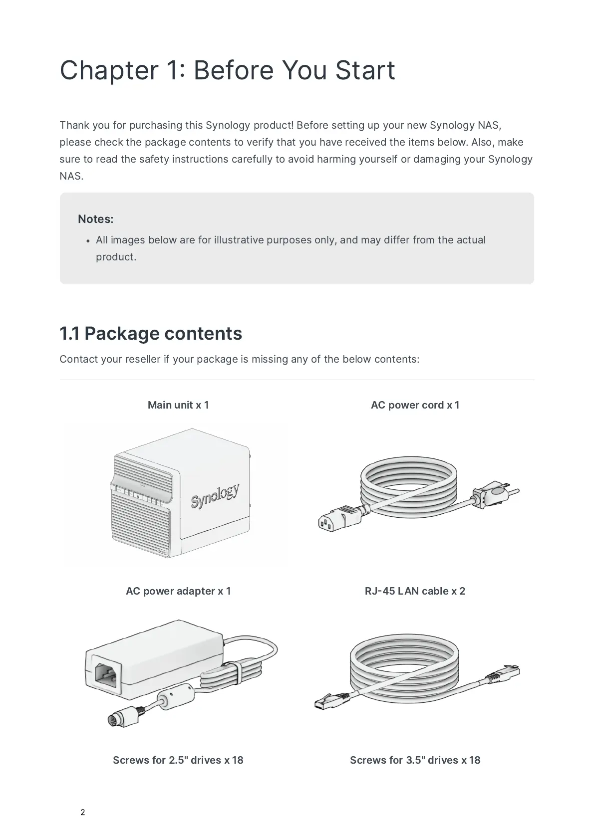 Synology DiskStation DS423 - Chapter 1: Before You Start; 1.1 Package contents; 1.2 Synology DS423 at a glance; 1.3 System modes and LED indicators