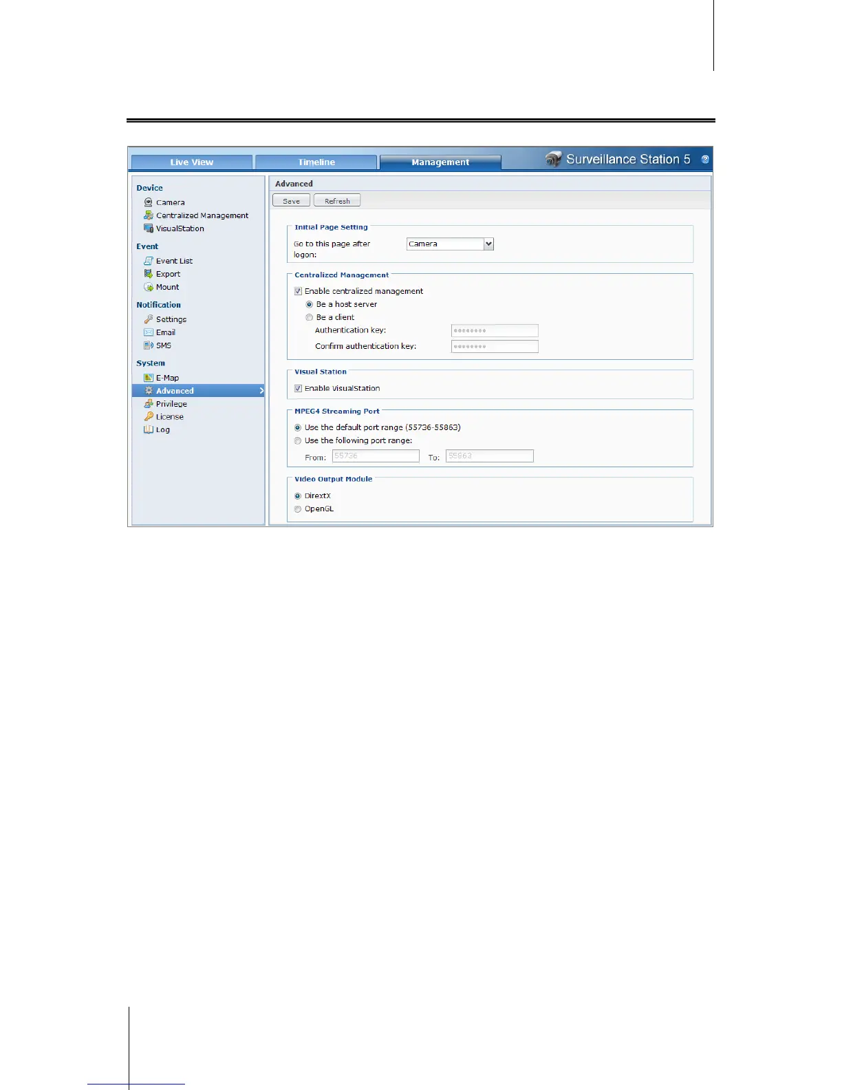 Go to System > Advanced under Management to manage the advanced settings for Surveillance Station.