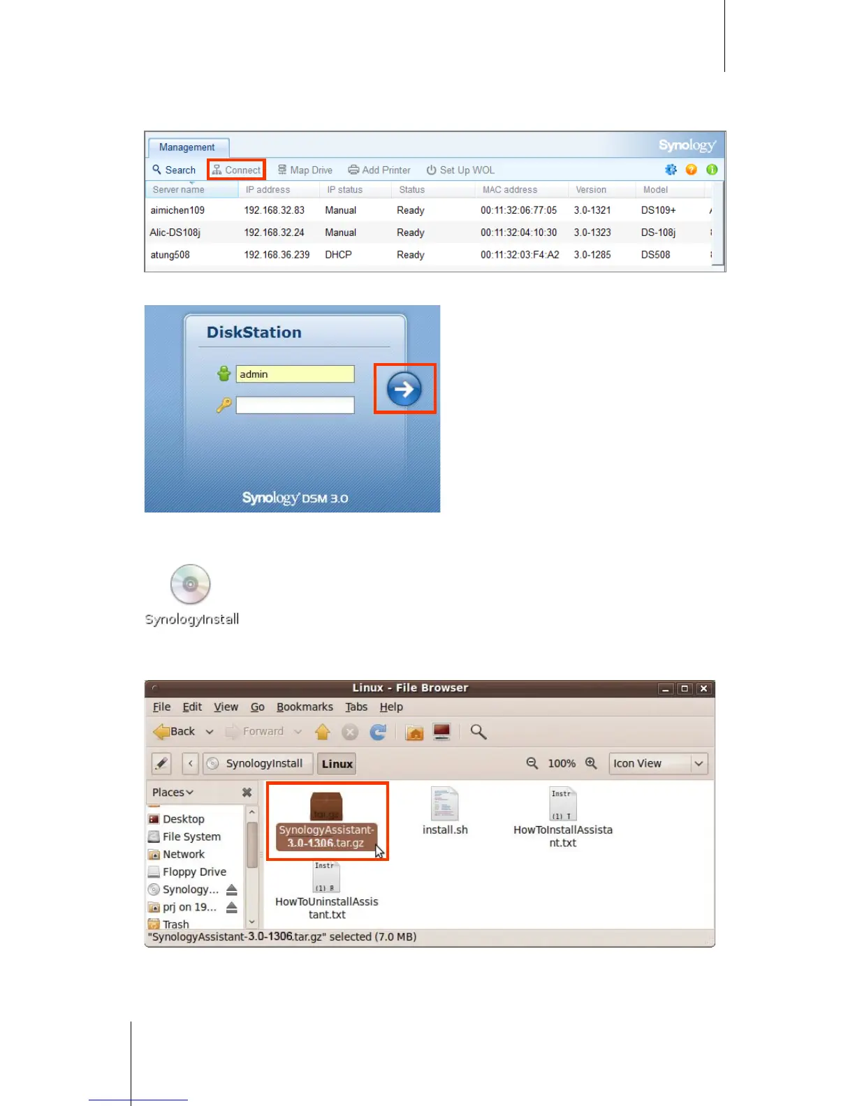 1 Insert the installation CD into your computer, and then double-click the SynologyInstall icon on the desktop.