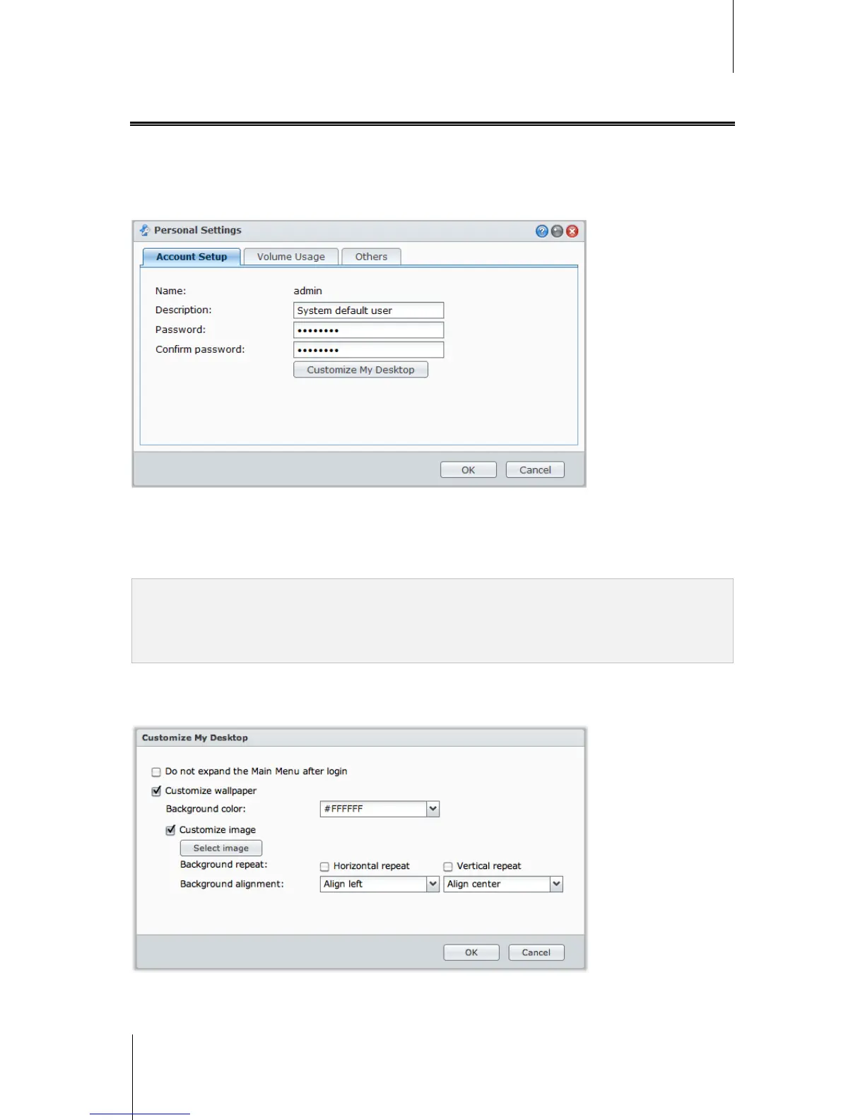 Under Account Setup, click Customize My Desktop to customize desktop background color or wallpaper.