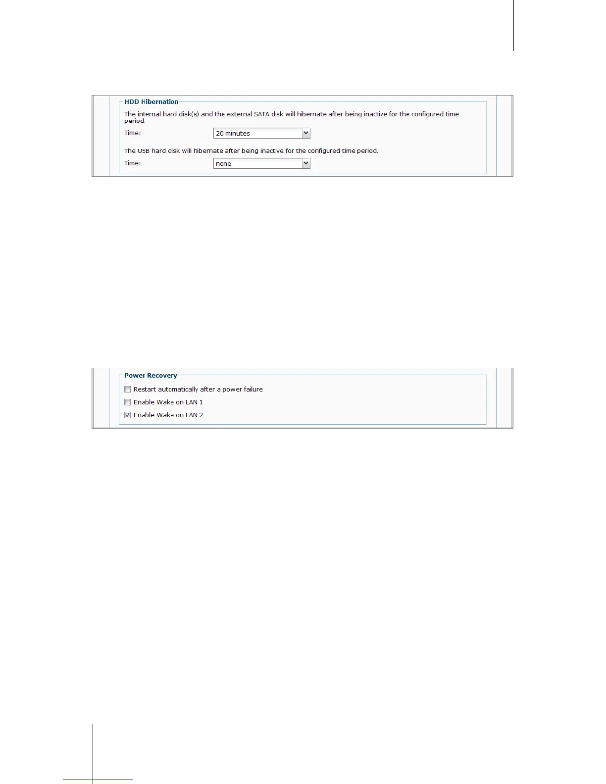 A time period: Set the internal hard drive, external eSATA or USB disk to HDD hibernation mode after the