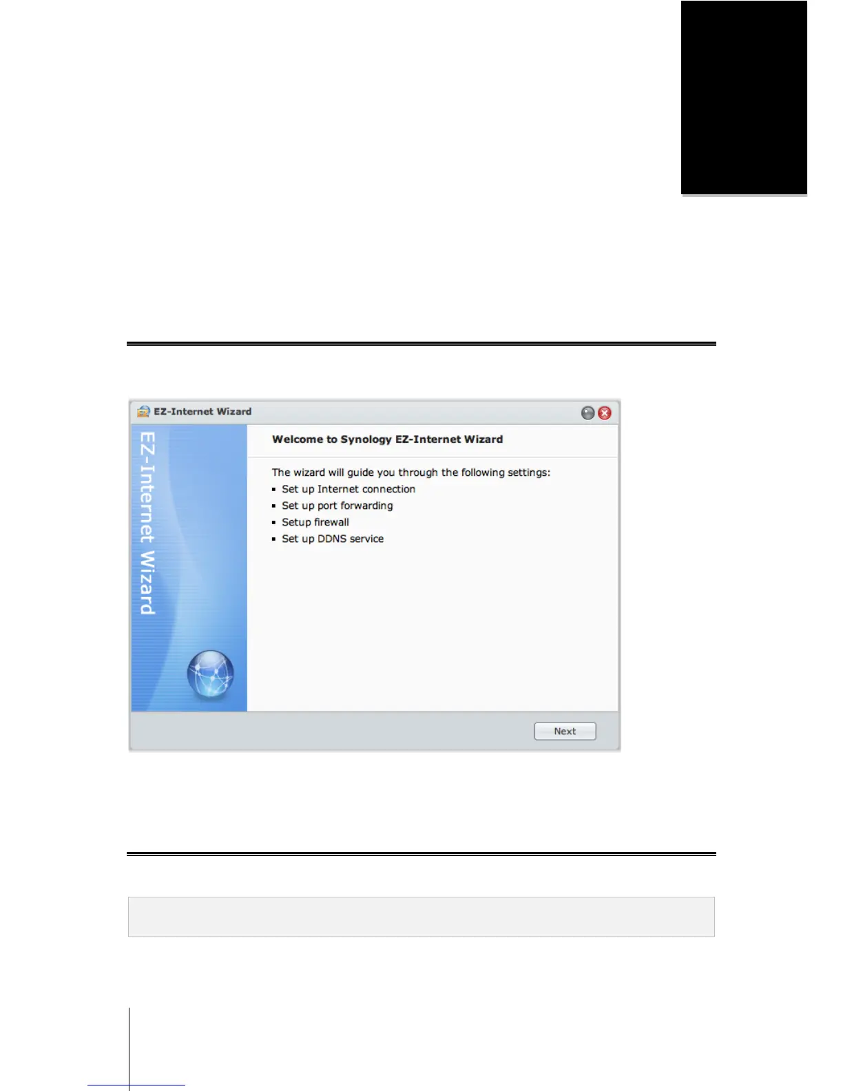 This chapter explains how to set up Internet connection with the easy-to-use Synology EZ-Internet wizard, or with
