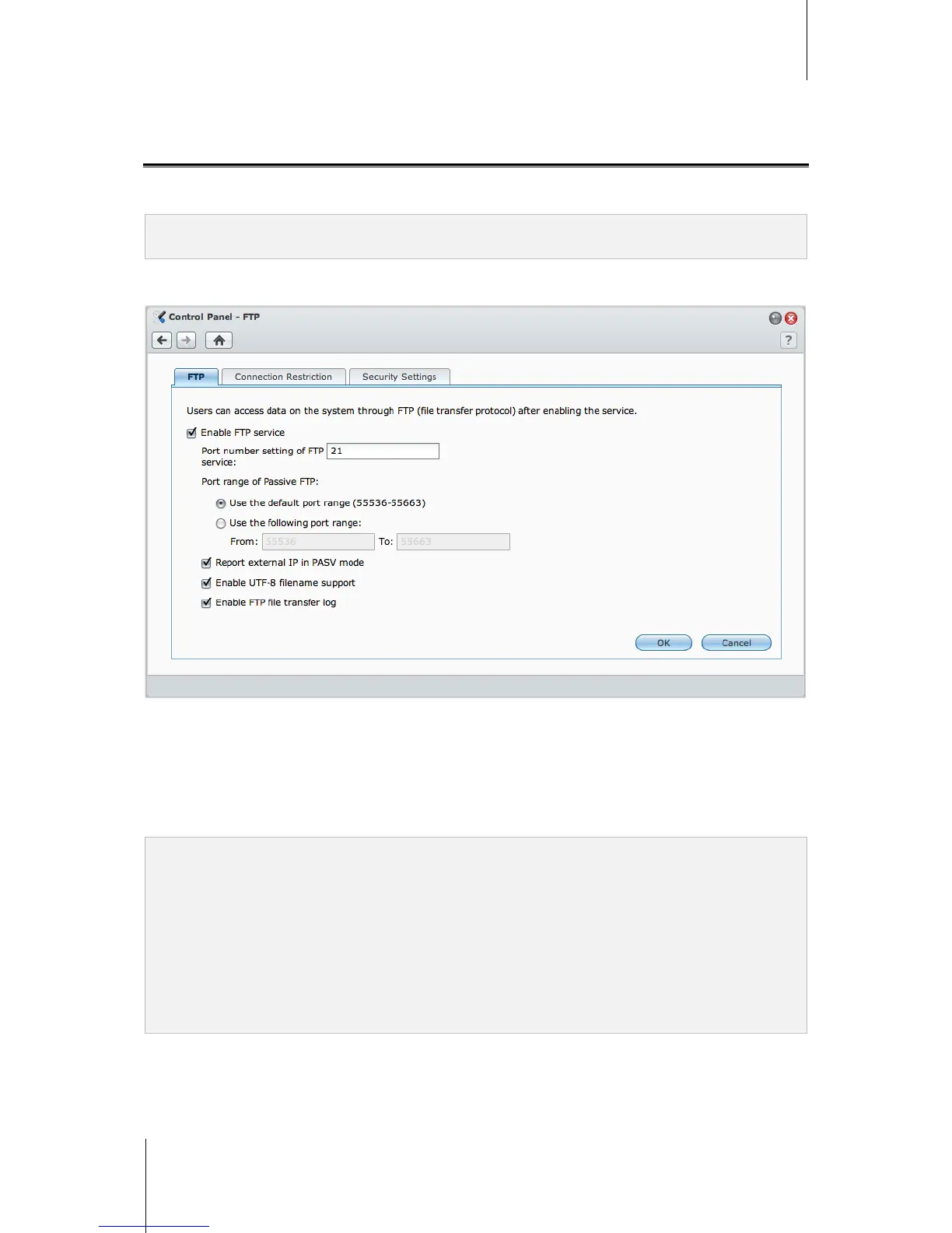 Go to Main Menu > Control Panel > FTP to enable FTP service, allowing users to upload or download
