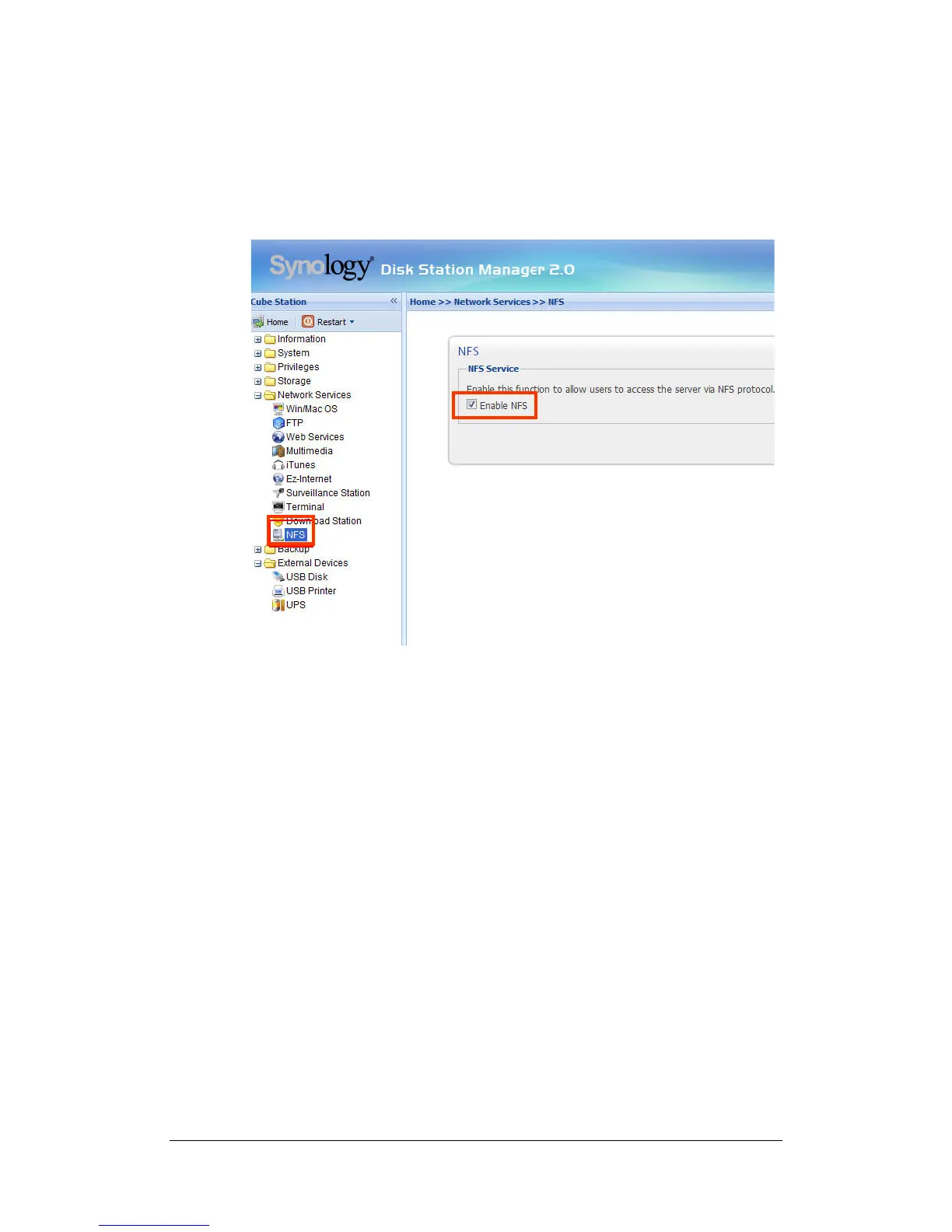 With the built-in NFS option, the administrator can quickly enable NFS and set