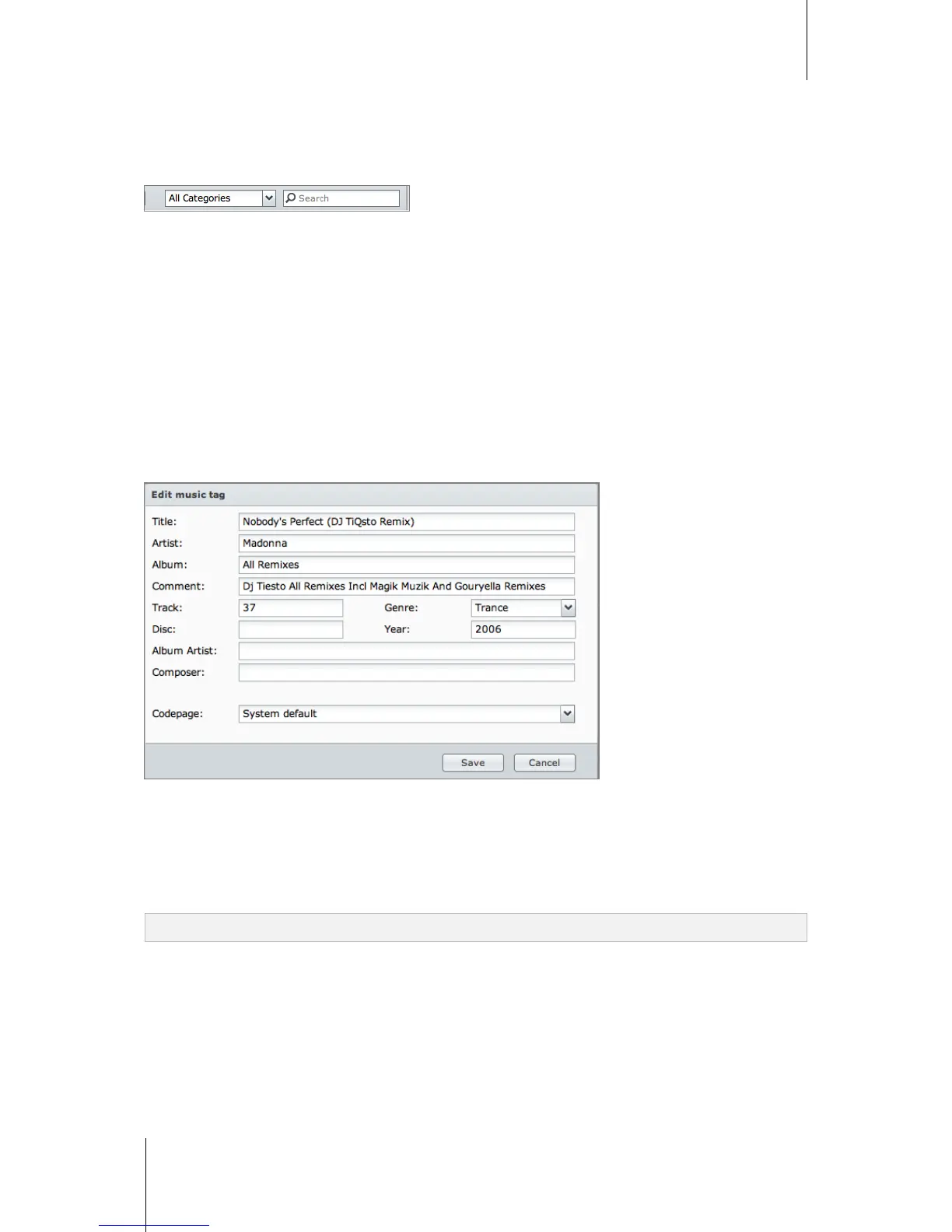 2 Here you can view or modify the music file's information, or choose a language from the Codepage drop-down