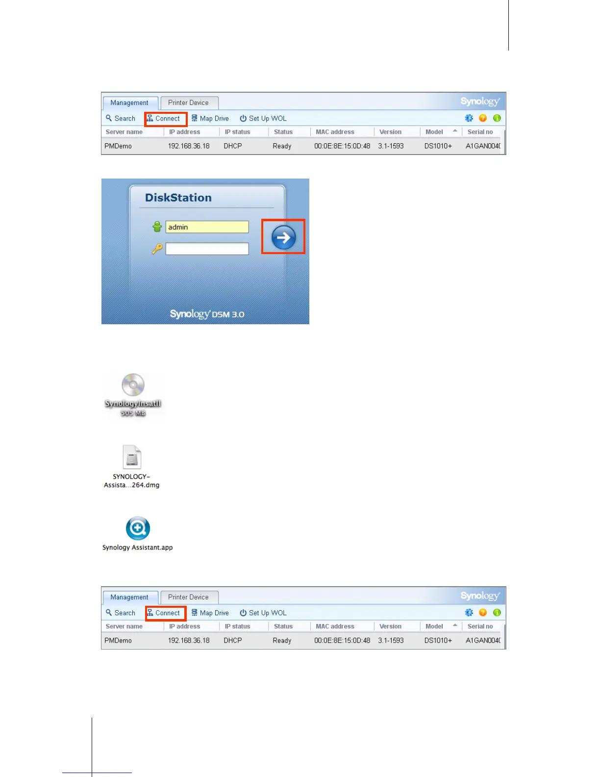 5 Choose the server you want to manage. Click Connect or double-click the selected server to go to DSM's