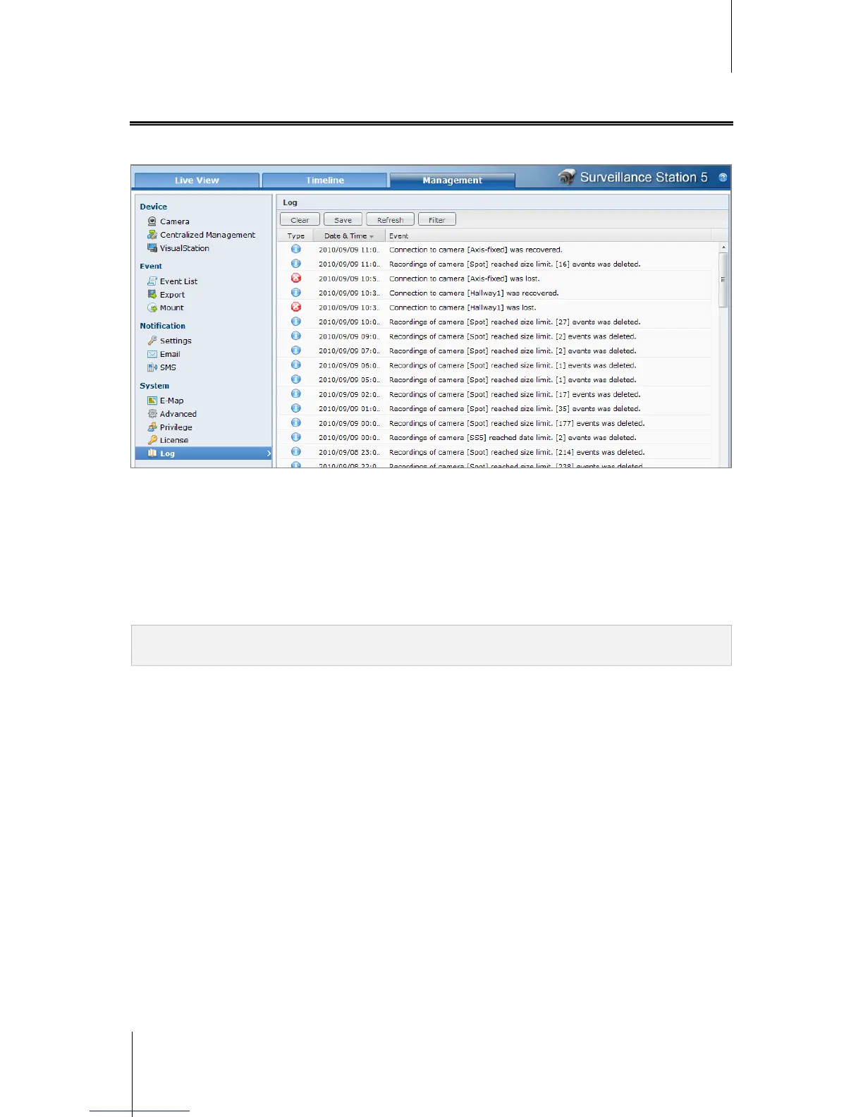Go to System > Log under Management to see critical events such as camera disconnection or changes on the