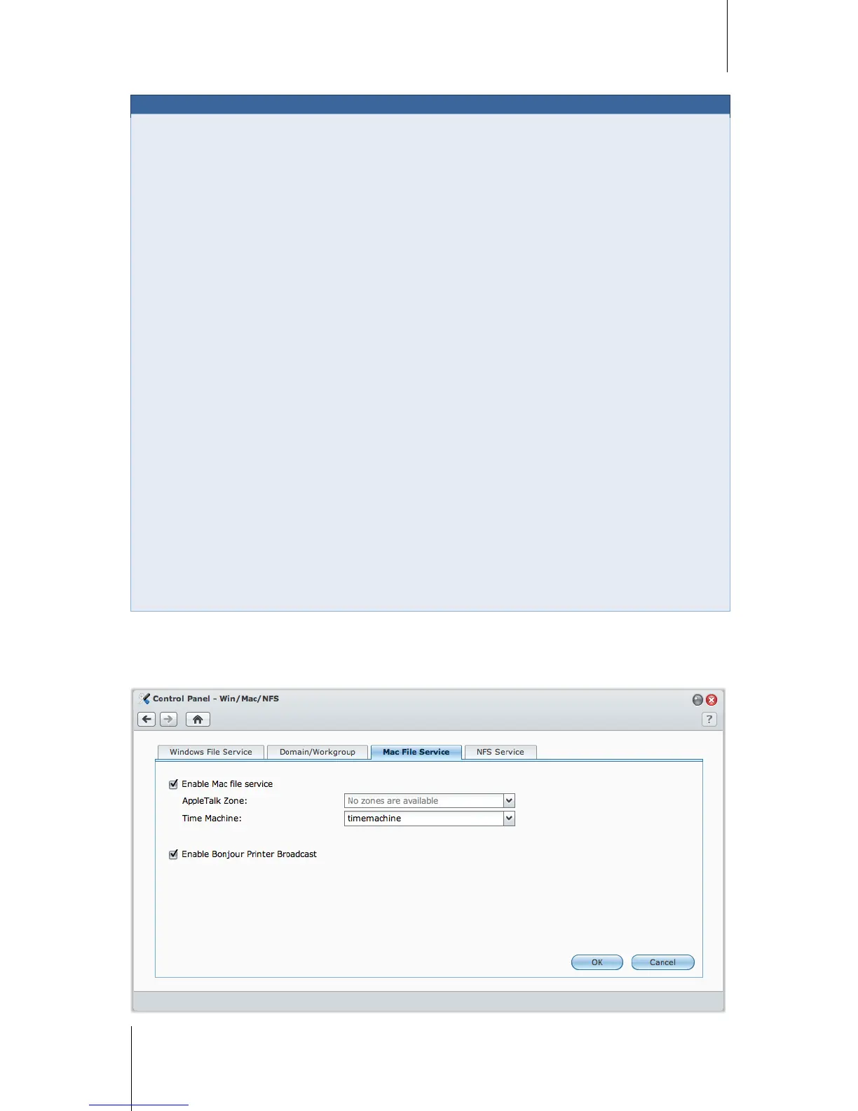 Click the Mac File Service tab at Main Menu > Control Panel > Win/Mac/NFS to make Synology DiskStation a