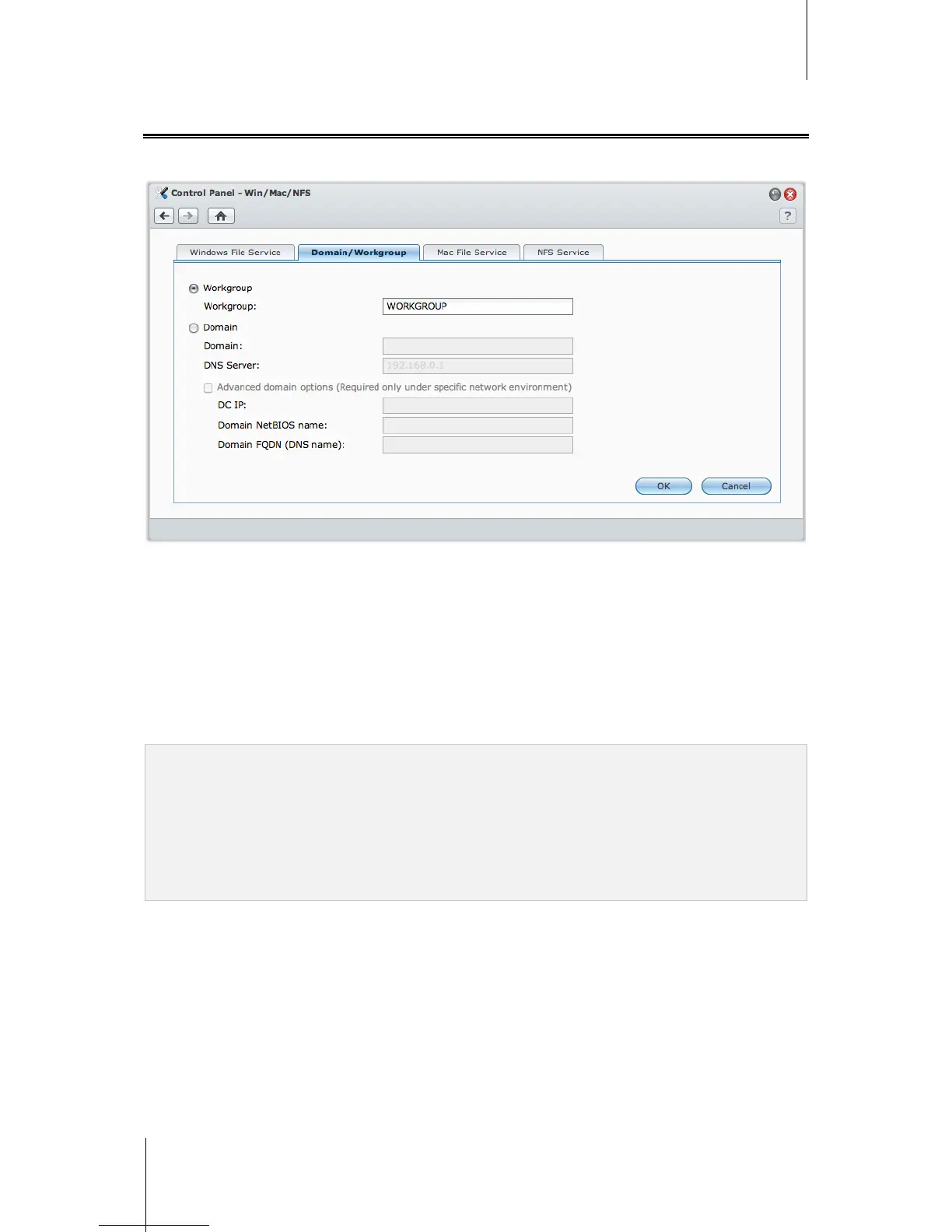 Click the Domain/Workgroup tab at Main Menu > Control Panel > Win/Mac/NFS to add your