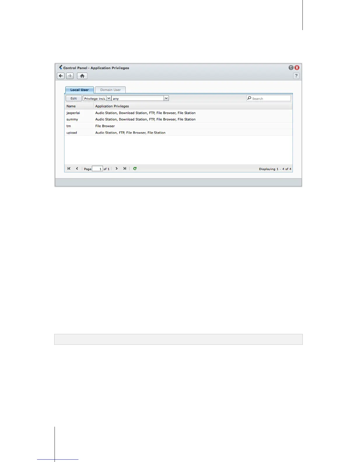 1 Click the Local User or Domain User tab, depending on which type of users whose application privileges you