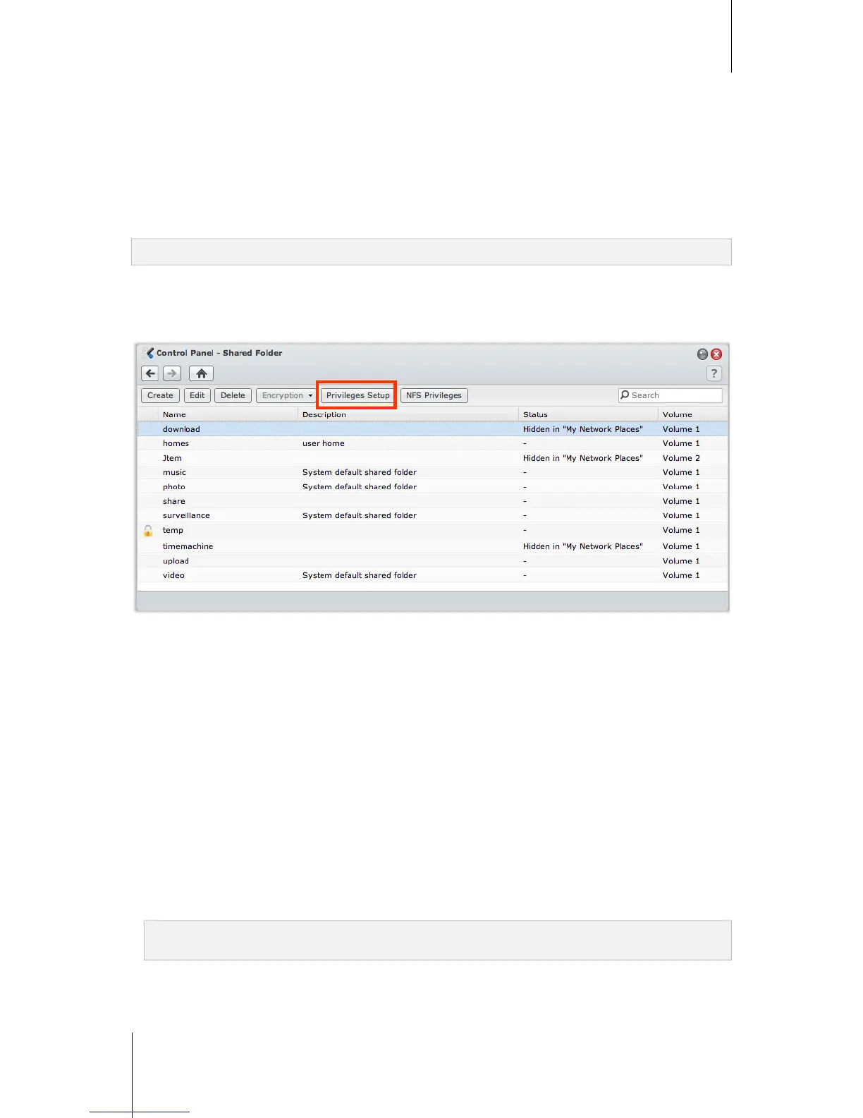 1 Select the shared folder you want to edit from the shared folders list, and click Privileges Setup to open the