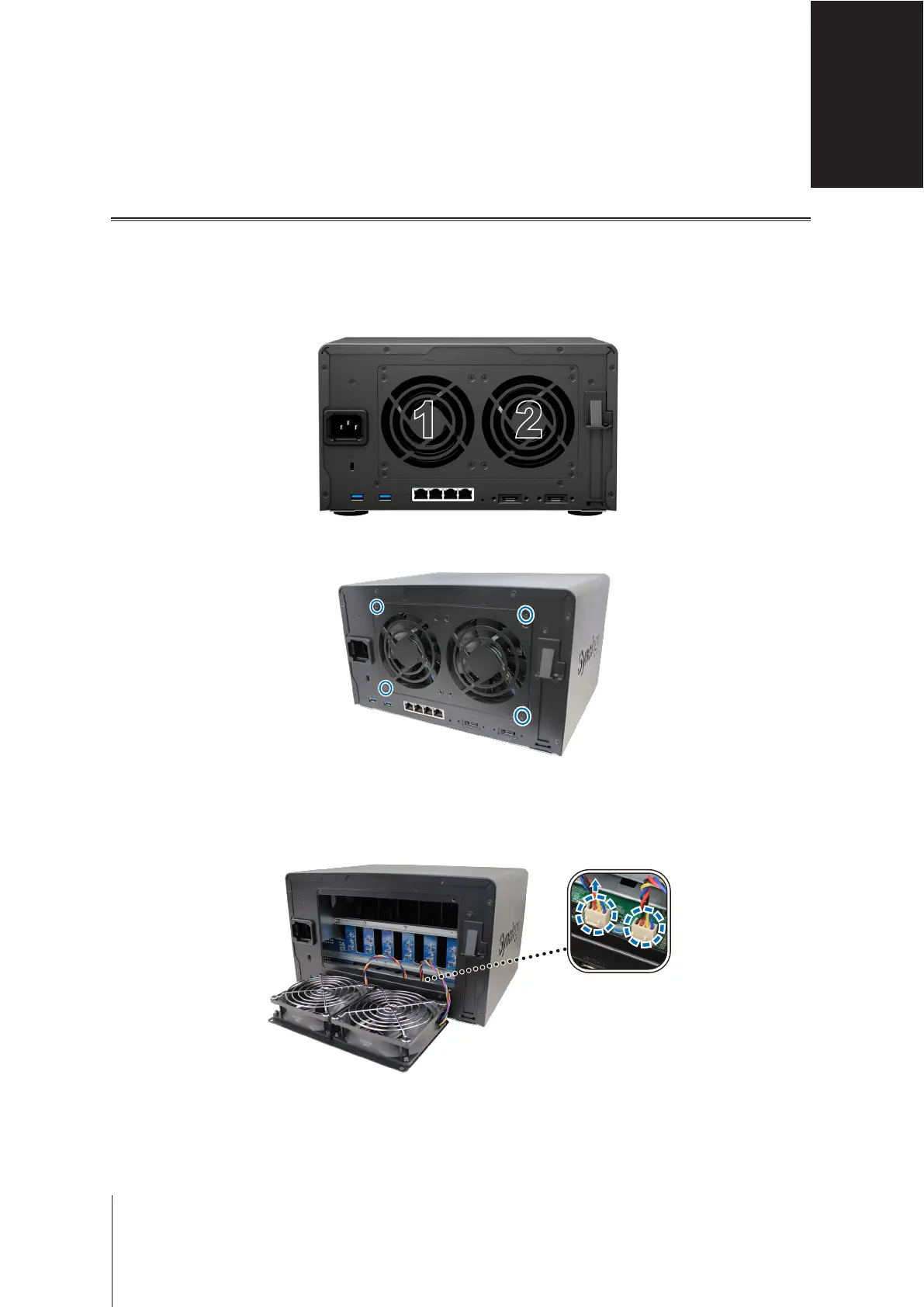 If the cooling fan located on the back of the Synology NAS malfunctions, please follow the steps below to remove
