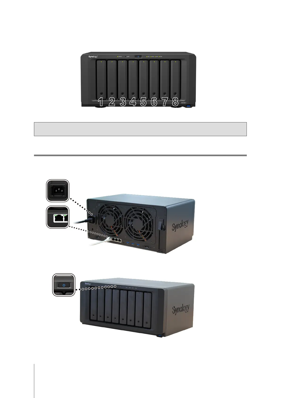Connect one end of the AC power cord to the power port of your Synology NAS. Connect the other end to a