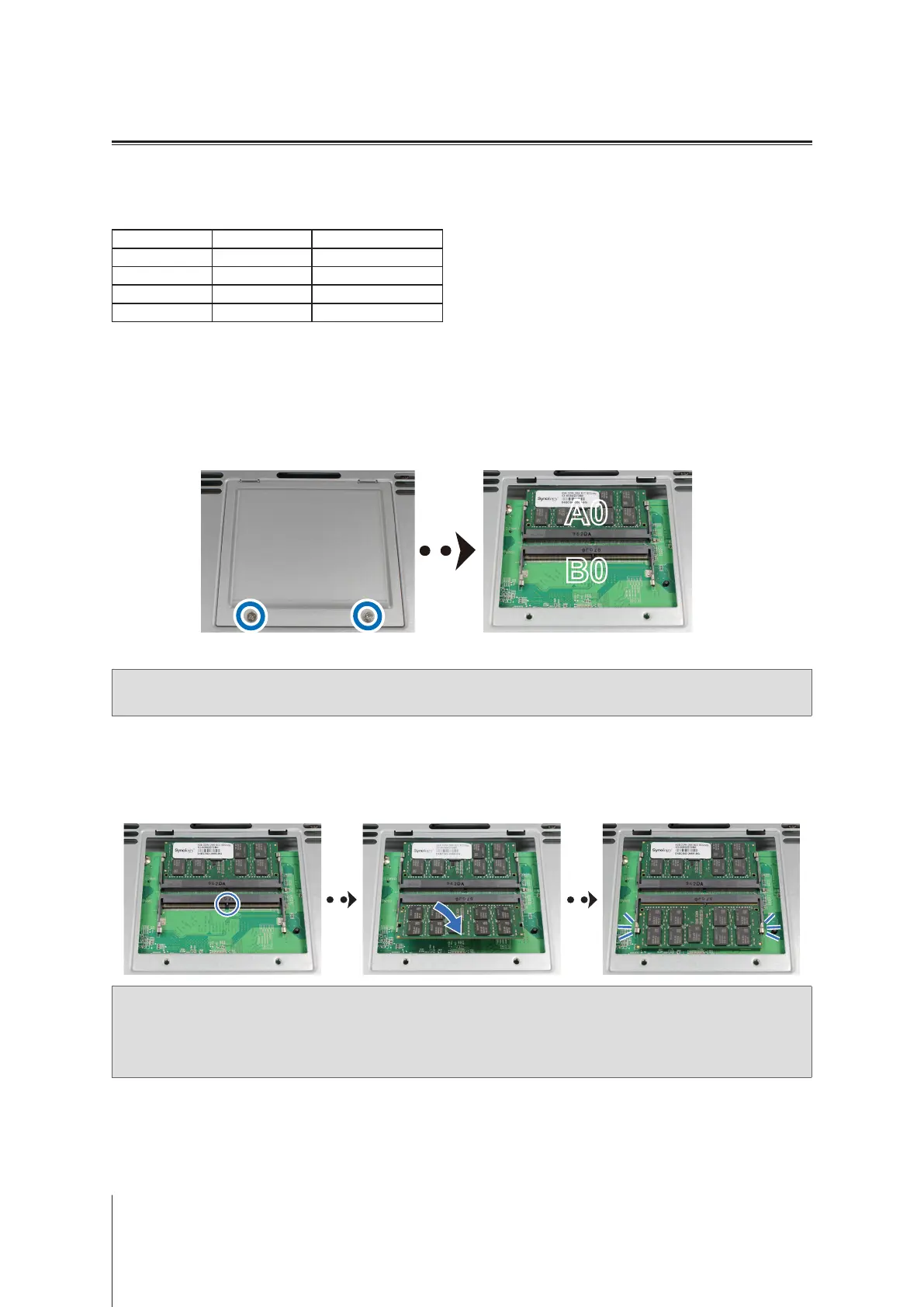 • Synology will not provide full product warranty or technical support if a non-Synology memory module is