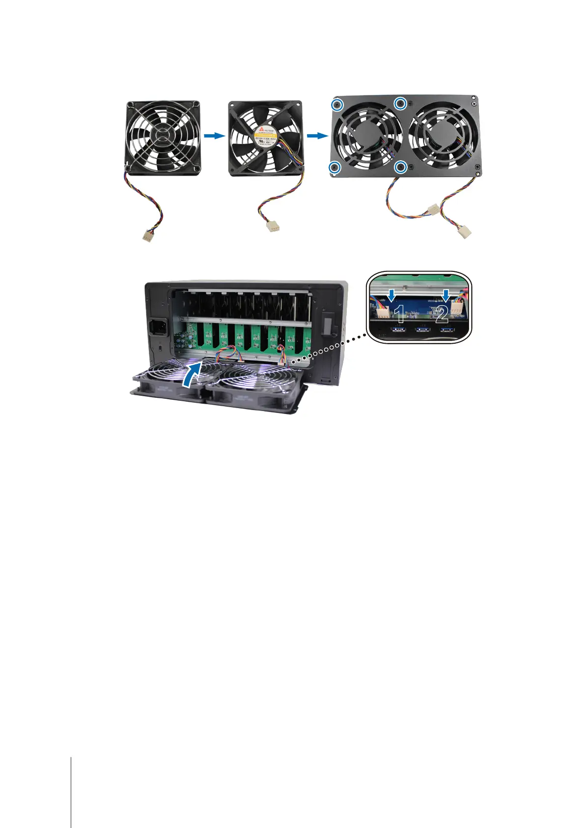Plug the fan cables into your Synology NAS as shown below.