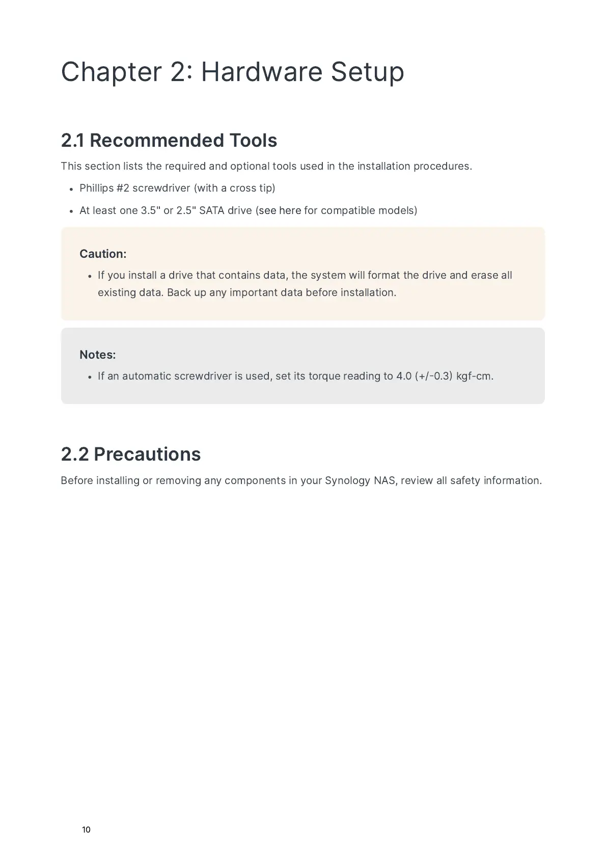 Synology DS224+ - Chapter 2: Hardware Setup; 2.1 Recommended Tools; 2.2 Precautions