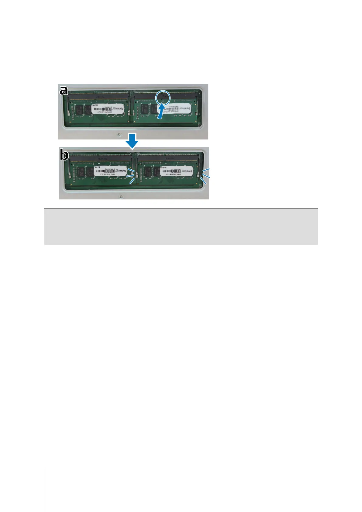• Synology will not provide full product warranty or technical support if a non-Synology memory module is