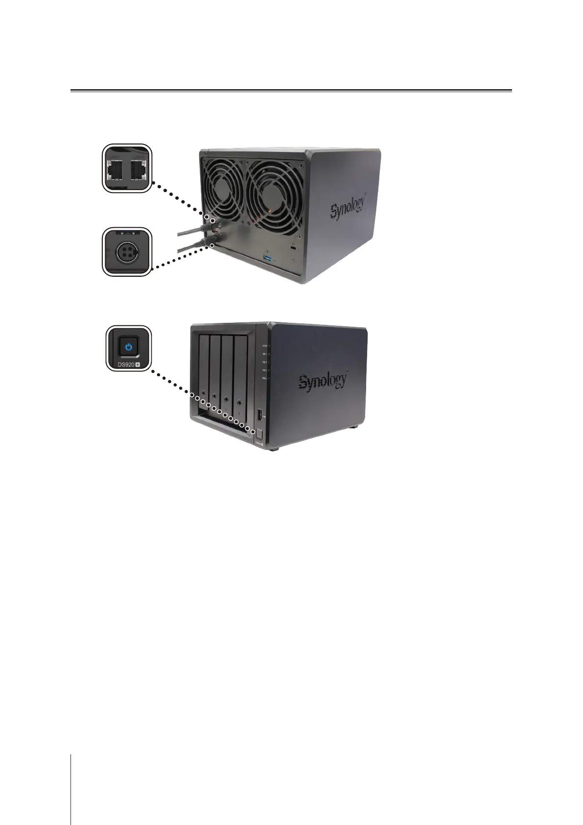 Connect one end of the AC power adapter to the power port of your Synology NAS. Connect one end of the AC