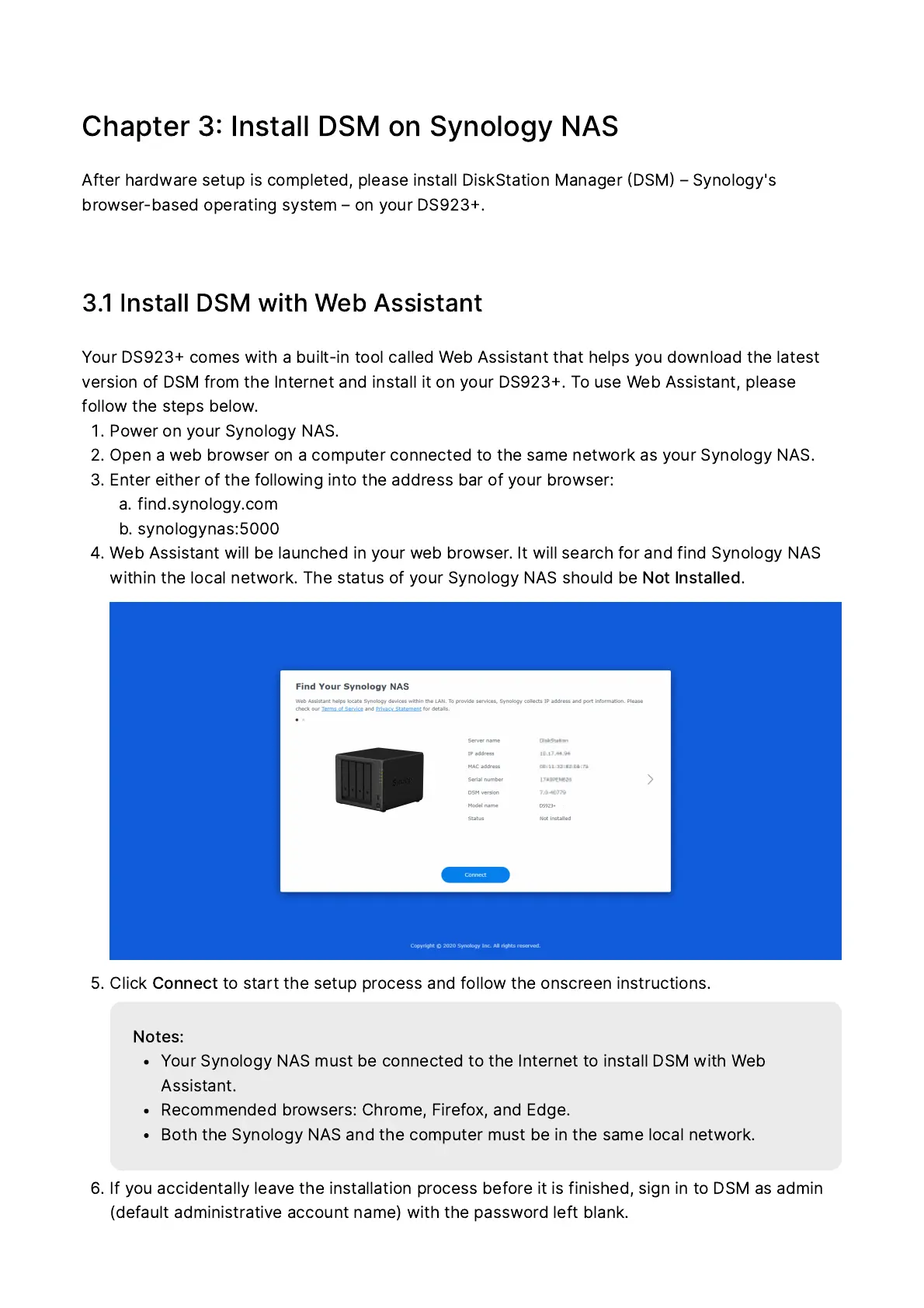 Synology DS923+ - Chapter 3: Install DSM on Synology NAS; 3.1 Install DSM with Web Assistant