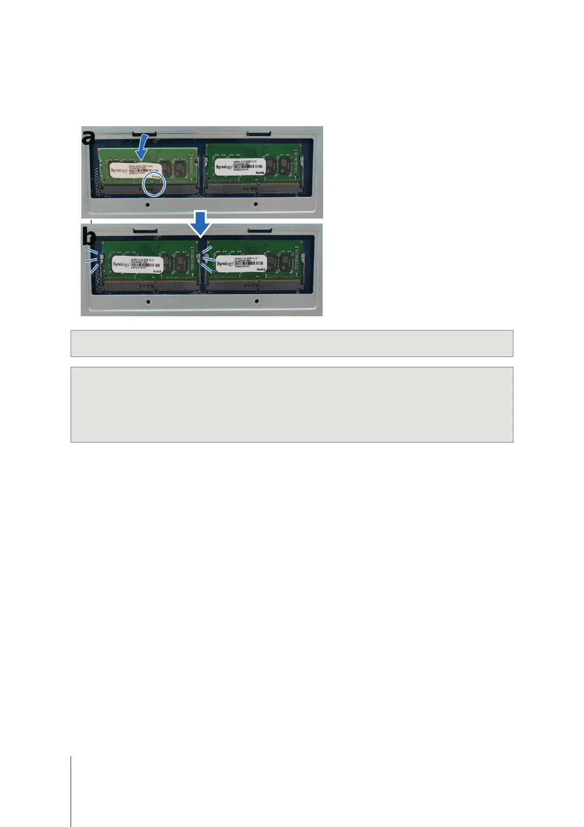 • Synology will not provide complete product warranty or technical support if non-Synology RAM modules are used