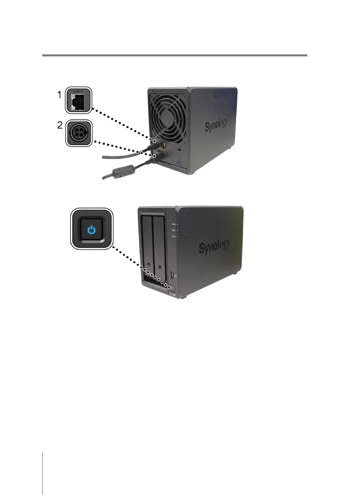 Connect one end of the AC power adapter to the power port of your Synology NAS. Connect one end of the AC
