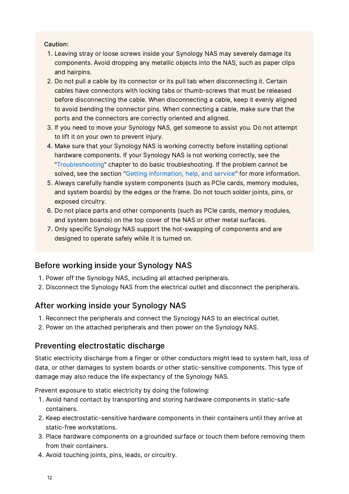Synology RS2423+ - Before Working Inside Your Synology NAS; After Working Inside Your Synology NAS; Preventing Electrostatic Discharge