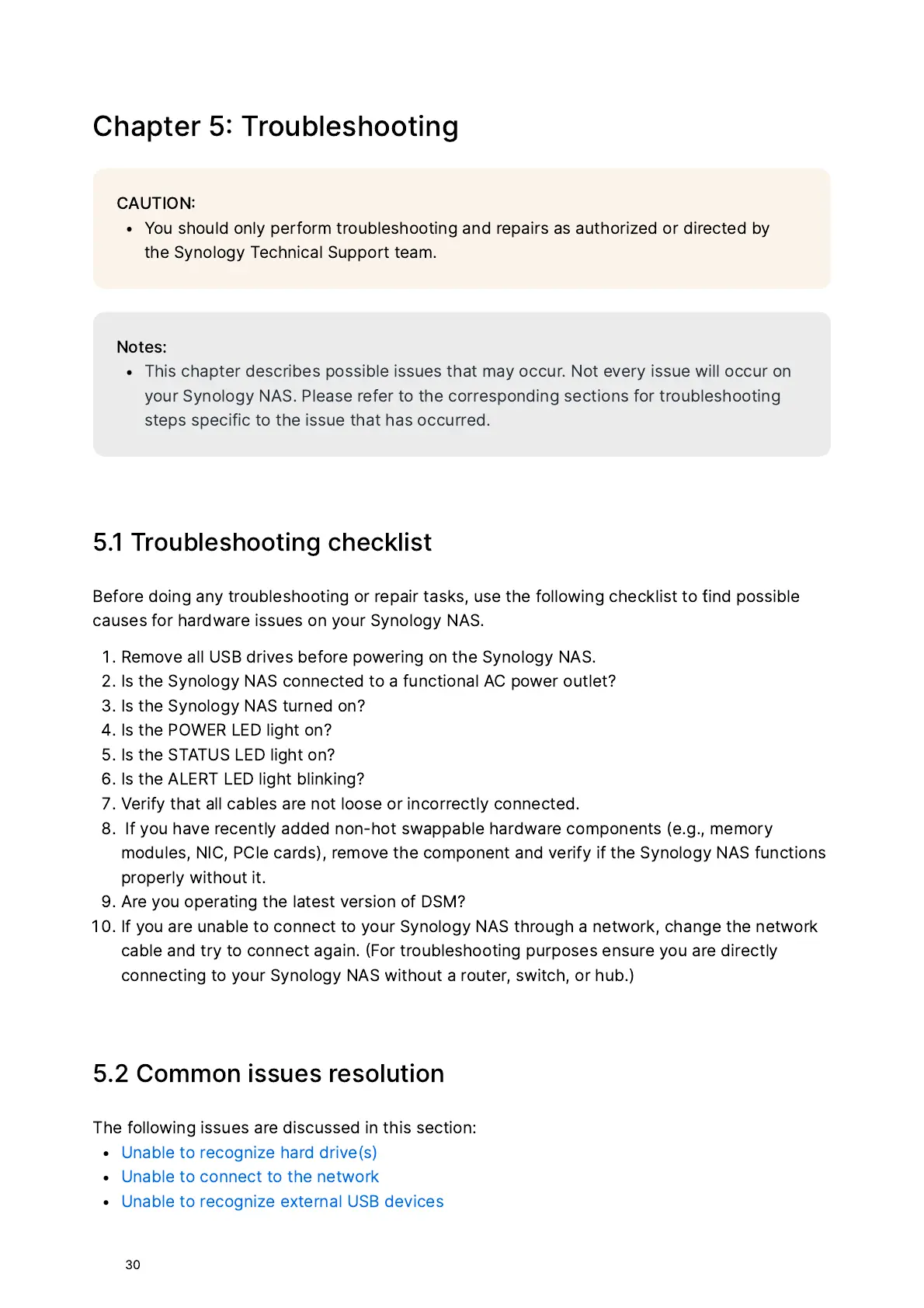 Synology RS2423+ - Chapter 5: Troubleshooting; 5.1 Troubleshooting Checklist; 5.2 Common Issues Resolution