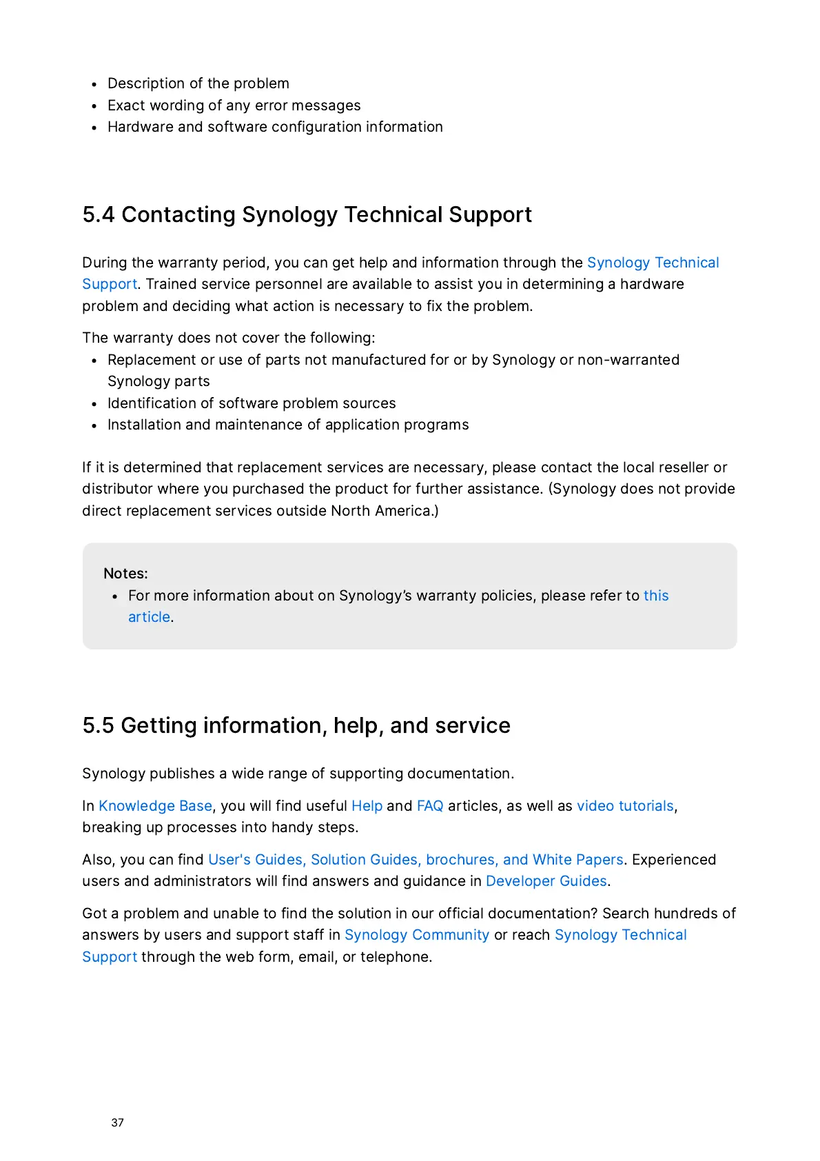 Synology RS2423+ - 5.4 Contacting Synology Technical Support; 5.5 Getting Information, Help, and Service
