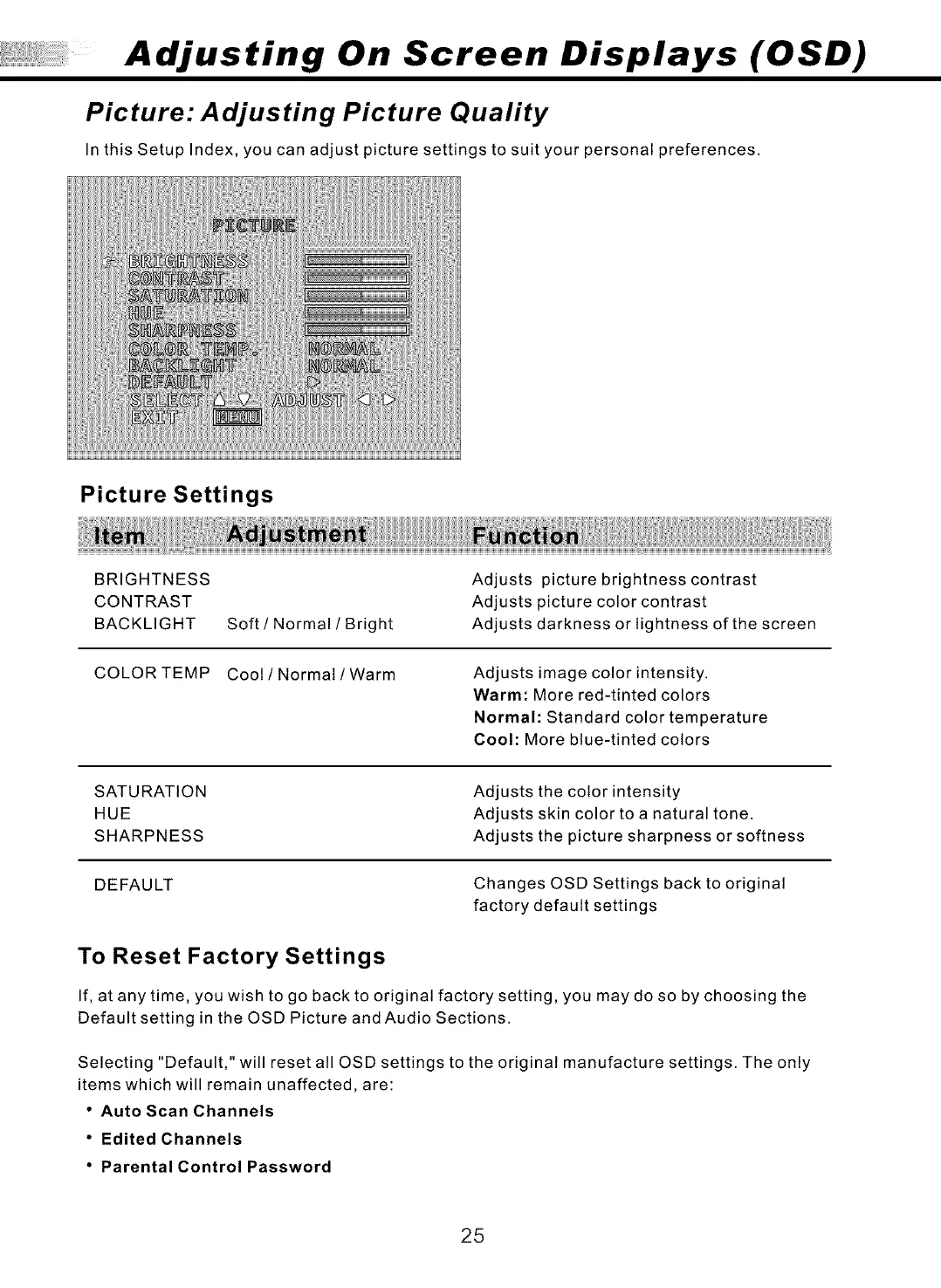 In this Setup Index, you can adjust picture settings to suit your personal preferences.