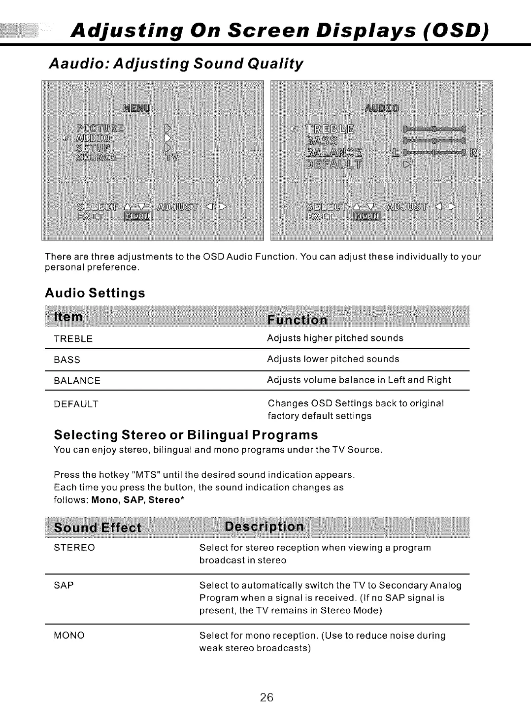 You can enjoy stereo, bilingual and mono programs under the TV Source.