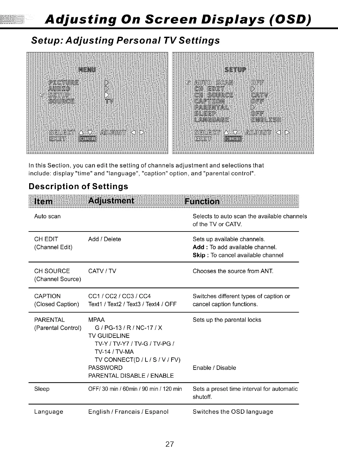 Language English / Francais / Espanol Switches the OSD language