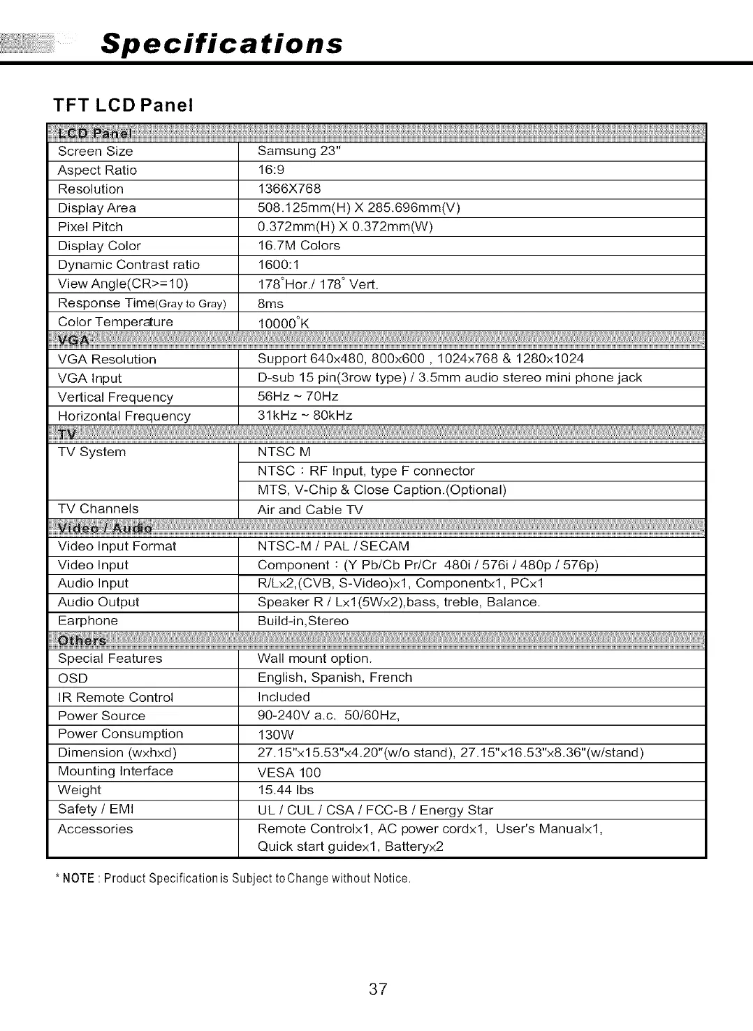 * NOTE : Product Specification is Subject t0Change without Notice.