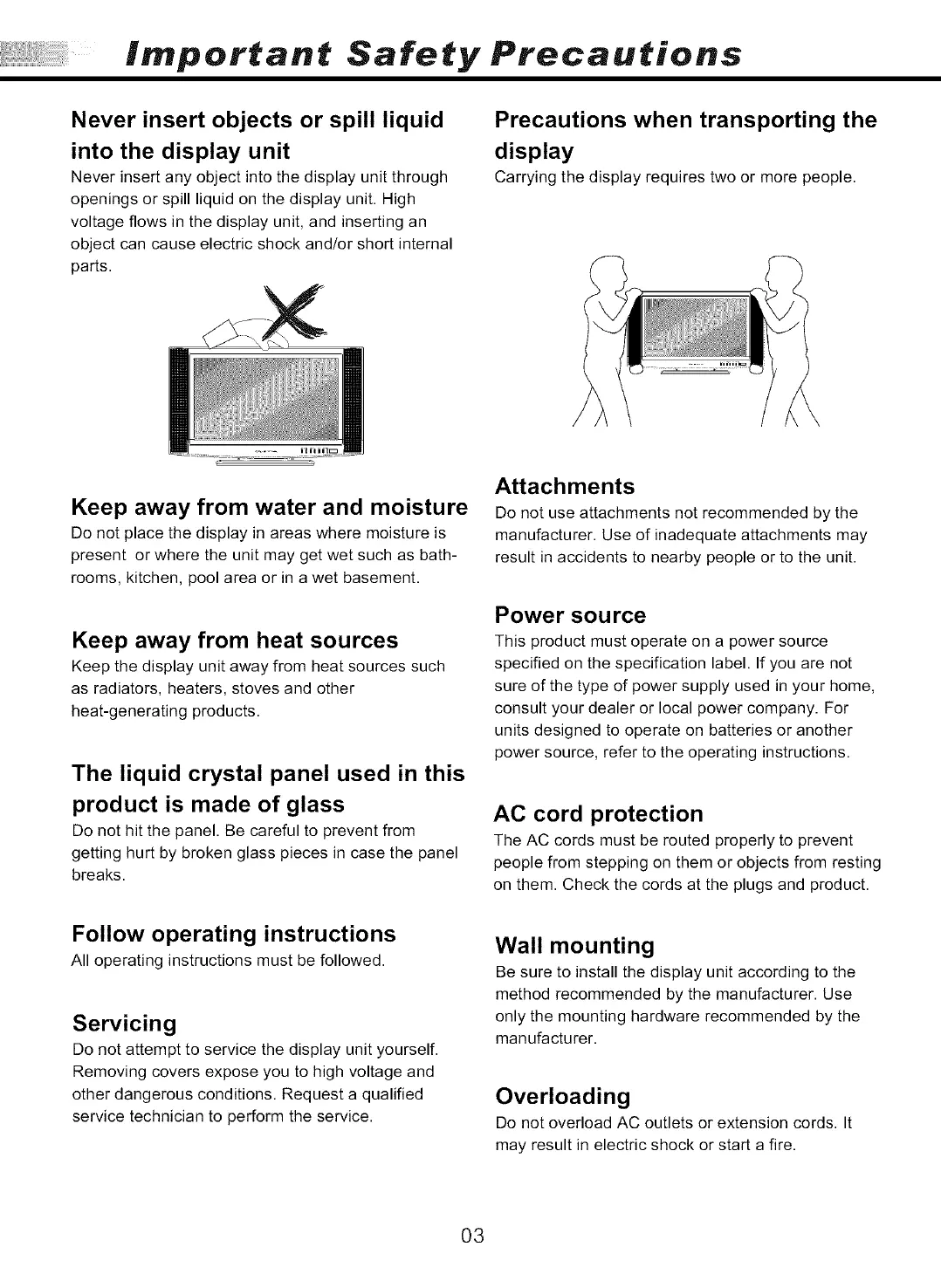 openings or spill liquid on the display unit. High