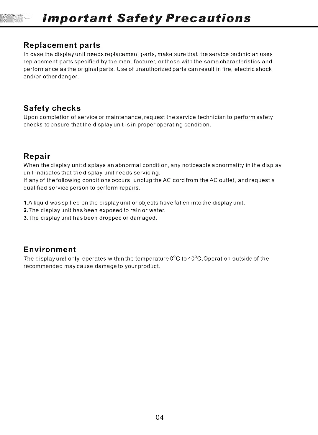 In case the display unit needs replacement parts, make sure that the service technician uses