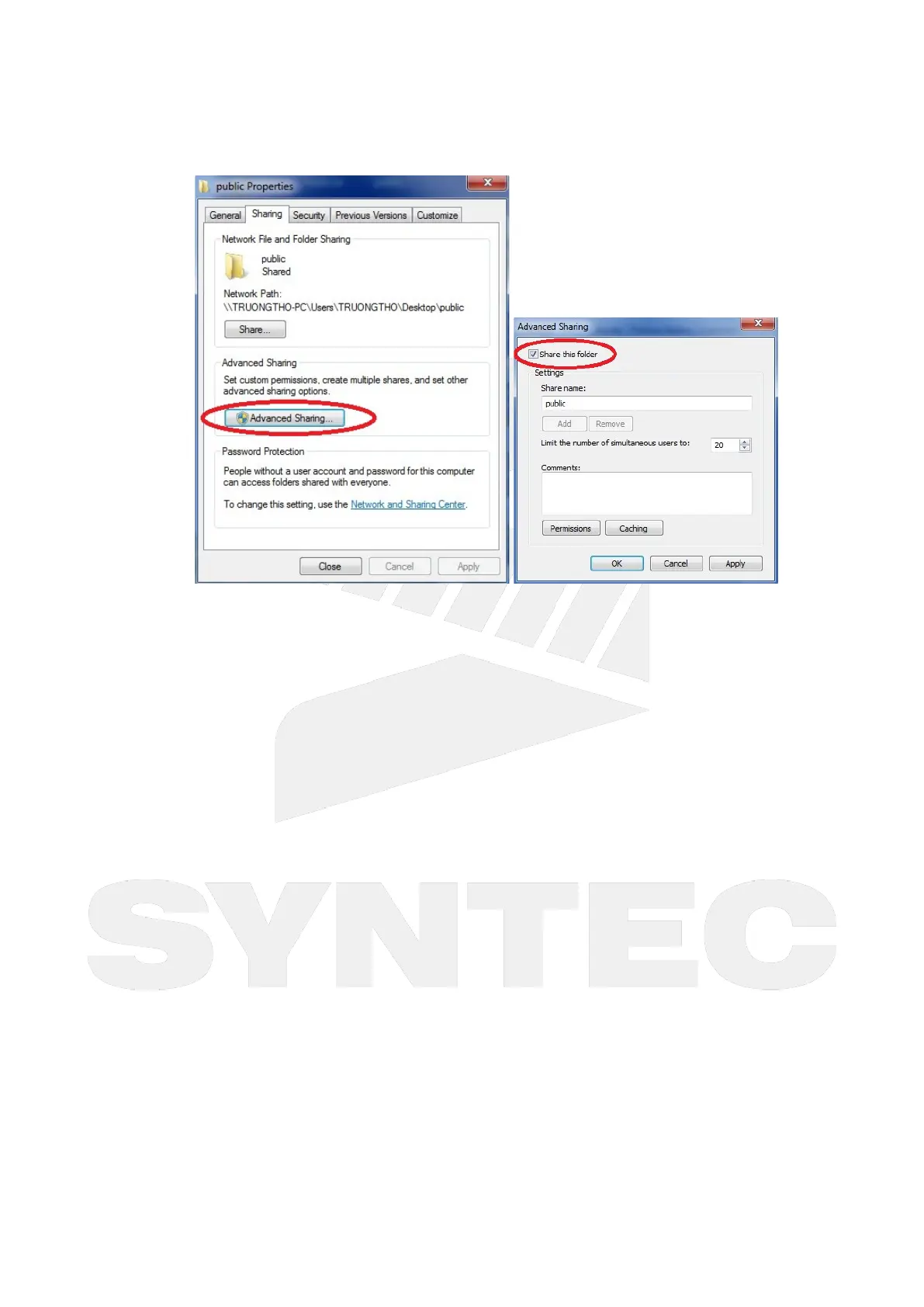 Left-click on "advanced sharing" and select "share this folder" to everyone.