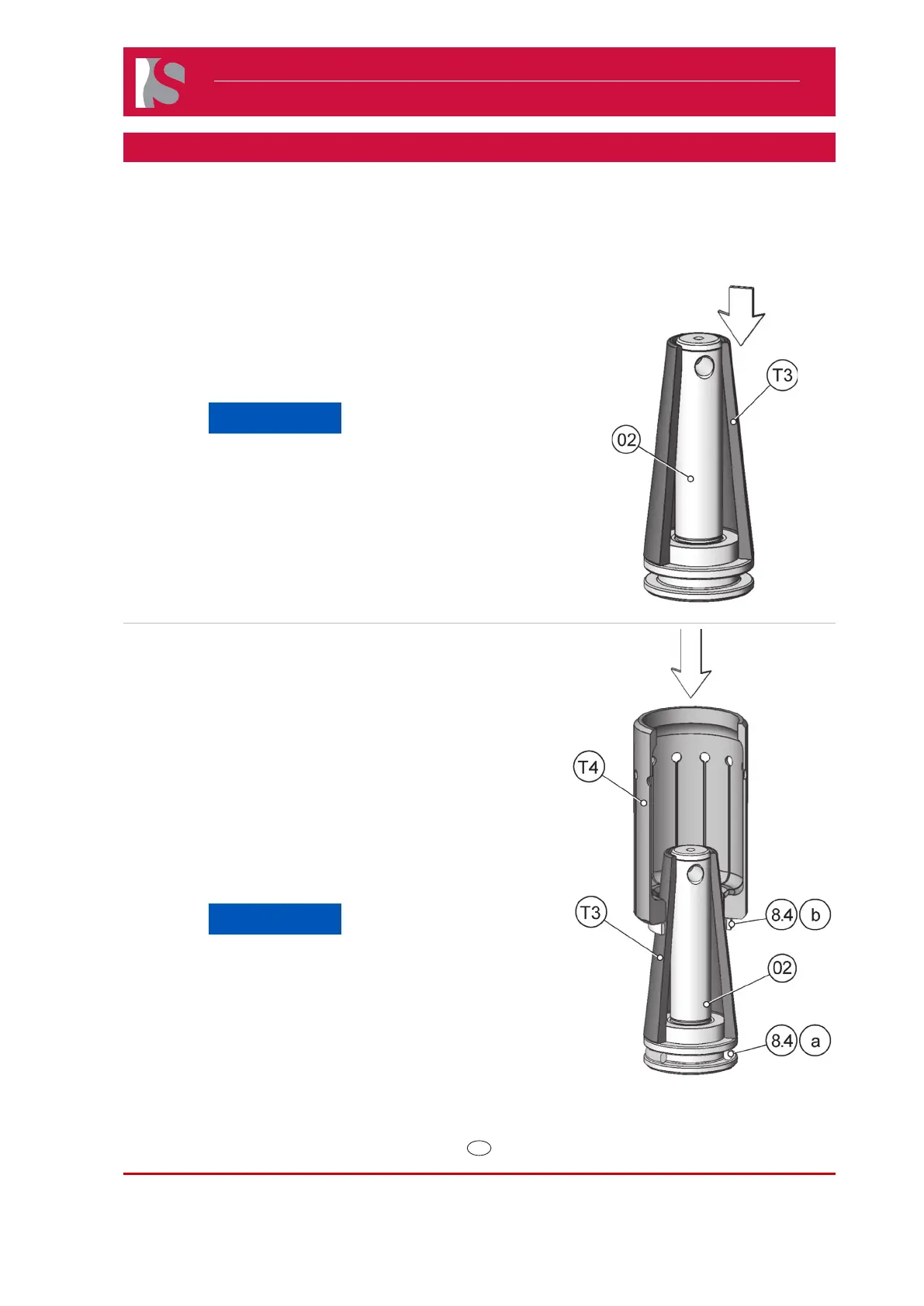 1) Fit the mounting cone (T3) on the piston (02).