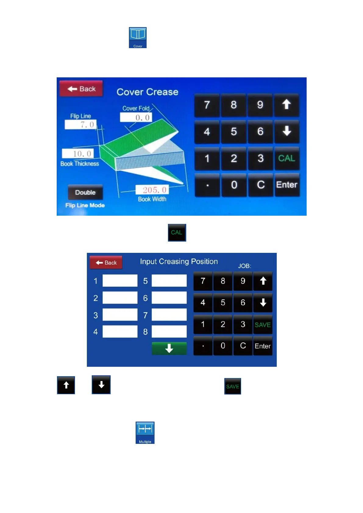 8.2. Cover crease: Press then tip on the blank box then enter the figures